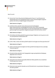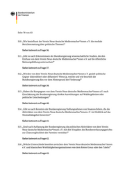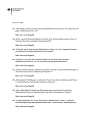 Seite 75 von 83 487. „Gibt es Fälle, in denen der Verein Neue de utsche Medienmacher*innen e.V. explizit für oder gegen eine Partei geworben hat?“ Siehe Antwort zu Frage 13. 488. „Wann wurde die Gemeinnützigkeit des Ve reins Neue deutsche Medienmacher*innen e.V. letztmalig durch das zuständige Finanzamt geprüft?“ Siehe Antwort zu Frage 14. 489. „Wurde der Verein Neue deutsche Medien macher*innen e.V. in de r Vergangenheit wegen parteipolitischer Betätigung abgemahnt oder verwarnt?“ Siehe Antwort zu Frage 15. 490. „Wie groß ist der Anteil der finanzie llen Mittel von dem Verein Neue deutsche Medienmacher*innen e.V., der aus staatlichen Förderprogrammen stammt?“ Siehe Antwort zu Frage 16. 491. „Wie hoch ist der Anteil der Spenden aus der Wirtschaft oder von parteinahen Stiftungen an den Verein Neue deutsche Medienmacher*innen e.V.?“ Siehe Antwort zu Frage 17. 492. „Gibt es direkte Verbindungen zwischen dem Verein Neue deutsc he Medienmacher*innen e.V. und bestimmten Parteien oder politischen Akteuren?“ Siehe Antwort zu Frage 18. 493. „Haben (ehemalige) Vorstände oder Fü hrungspersonen des Vereins Neue deutsche Medienmacher*innen e.V. politische Ämter od er enge Verbindungen zu Parteien?“ Siehe Antwort zu Frage 18. 494. „Inwiefern beeinflusst de r Verein Neue deutsche Medienmacher*innen e.V. politische Entscheidungsprozesse oder Gesetzesvorhaben nach Einschätzung der Bundesregierung?“ Siehe Antwort zu Frage 20.