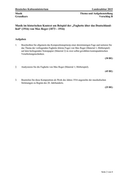 Hessisches Kultusministerium Landesabitur 2015 Musik Thema und Aufgabenstellung Grundkurs Vorschlag B Seite 2 von 4 Musik im historischen Kontext am Beispiel der Fughette über das Deutschland- lied (1916) von Max Reger (1873 1916) Aufgaben 1. Beschreiben Sie allgemein das Kompositionsprinzip einer dreistimmigen Fuge und notieren Sie das Thema der vorliegenden Fughette (kleine Fuge) von Max Reger (Material 1, Hörbeispiel) auf dem beiliegenden Notenpapier (Material 2) in zwei selbst gewählten kontrapunktischen Verarbeitungstechniken. (30 BE) 2. Analysieren Sie die Fughette von Max Reger (Material 1, Hörbeispiel). (45 BE) 3. Beurteilen Sie diese Komposition als Werk des Jahres 1916 angesichts der musikalischen Strömungen zu Beginn des 20. Jahrhunderts. (25 BE)