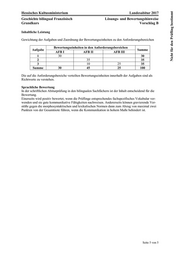 Nicht für den Prüfling bestimmt Hessisches Kultusministerium Landesabitur 2017 Geschichte bilingual Französisch Lösungs- und Bewertungshinweise Grundkurs Vorschlag B Seite 5 von 5Inhaltliche Leistung Gewichtung der Aufgaben und Zuordnung der Bewertungseinheiten zu den Anforderungsbereichen Aufgabe Bewertungseinheiten in den Anforderungsbereichen Summe AFB I AFB II AFB III 1 30 30 2 35 35 3 10 25 35 Summe 30 45 25 100 Die auf die Anforderungsbereiche verteilten Bewertungseinheiten innerhalb der Aufgaben sind als Richtwerte zu verstehen. Sprachliche Bewertung In der schriftlichen Abiturprüfung in den bilingualen Sachfächern ist der Inhalt entscheidend für die Bewertung. Einerseits wird positiv bewertet, wenn die Prüflinge entsprechendes fachspezifisches Vokabular ver- wenden und sie gute kommunikative Fähigkeiten nachweisen. Andererseits können gravierende Ver- stöße gegen die morphosyntaktischen und lexikalischen Normen dann zum Abzug von maximal zwei Punkten von der Gesamtnote führen, wenn die Kommunikation in hohem Maße behindert ist.
