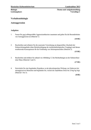 Hessisches Kultusministerium Landesabitur 2013 Biologie Thema und Aufgabenstellung Leistungskurs Vorschlag C Seite 2 von 5 Verhaltensbiologie Autoaggression Aufgaben 1. Fassen Sie zwei selbstgewählte Aggressionstheorien zusammen und geben Sie die Besonderheiten von Autoaggression an (Material 1). (10 BE) 2. Beschreiben und erläutern Sie die neuronale Verrechnung am dargestellten Abschnitt der Schmerzleitungsbahn (ohne Berücksichtigung der molekularbiologischen Vorgänge) und daraus resultierende Konsequenzen für die Fortleitung von Aktionspotenzialen (Material 2). (15 BE) 3. Beschreiben und erklären Sie anhand von Abbildung 3.2 die Beobachtungen an der Schmerzfaser einer Maus (Material 2 und 3). (17 BE) 4. Entwickeln Sie eine begründete Hypothese zu der physiologischen Wirkung von Naltrexon bei autoaggressiven Menschen und begründen Sie, warum die empfohlene Dosis bei 25mg/kg liegt (Material 1 bis 3). (8 BE)