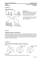 Hessisches Kultusministerium Landesabitur 2013 Biologie Thema und Aufgabenstellung Leistungskurs Vorschlag C Seite 4 von 5 Abbildung 2.1 Endorphinwirkung Erläuterungen: , , und gehören zu vier verschie- denen Neuronen. Die Pfeile kennzeichnen die Orte, an denen die dargestellten Poten- zialveränderungen gemessen wurden. An den chemischen Synapsen A/B und D/B wirkt Acetylcholin als Transmitter, an Sy- napse C/A Endorphin. Material 3 Medikamente gegen Autoaggression Zahlreiche Wissenschaftler versuchen, autoaggressive Verhaltensweisen neurobiologisch zu erklären. So könnte selbstverletzendes Verhalten z.B. auf einer Störung des Endorphinstoffwechsels beruhen, so dass Patienten mit Medikamenten, die Opiatwirkungen beeinflussen, geholfen werden könnte. Dazu wurden entsprechende Untersuchungen mit den Präparaten Naloxon und Naltrexon durchgeführt. Bei- de Präparate wirken prinzipiell gleich. Abbildung 3.1 Strukturformeln von Morphin, Naltrexon und Naloxon Erläuterung: cyclische Kohlenwasserstoffstruktur, die nicht Gegenstand der Aufgabe ist. D CBA