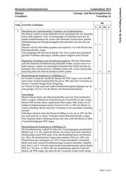 Nicht für den Prüfling bestimmt Hessisches Kultusministerium Landesabitur 2014 Biologie Lösungs- und Bewertungshinweise Grundkurs Vorschlag A2 Seite 2 von 4 BE Aufg. erwartete Leistungen I II IIIΣ 2 Darstellung des experimentellen Vorgehens zur Konditionierung: Die Bienen werden in einem Röhrchen fixiert und danach für vier Sekunden einem Duft ausgesetzt. Eine Versuchsgruppe (A) bekommt nach drei Se- kunden Duftpräsentation für weitere drei Sekunden Zuckerwasser geboten. Duftdarbietung und Flüssigkeitsangebot überschneiden sich also um eine Sekunde. Danach wird der Duft alleine gegeben und registriert, wie viele Bienen den Rüsselstreckreflex zeigen. Versuchsgruppe (B) dient als Kontrolle. Die Tiere werden dem prinzipiell gleichen Verfahren unterzogen, erhalten jedoch lediglich reines Wasser. Begründete Zuordnung einer Konditionierungsform: Mit dem Experiment soll eine klassische Konditionierung überprüft werden, da kein neues Ver- halten gelernt, sondern ein ursprünglich neutraler Reiz (Duft) mit dem un- bedingten Reiz (Zuckerwasser) verknüpft werden soll, so dass nach Kondi- tionierung allein der Duft die Reaktion (PER) auslöst. 2 1 4 3 10 3 Beschreibung der Ergebnisse in Abbildung 2.3: In Versuch A steigt die Anzahl der Bienen, die PER zeigen, von etwa 40% nach einem Versuch kontinuierlich bis auf ca. 80% nach drei Versuchen an. Weitere Versuche bringen keine Steigerung. In Versuch B zeigt auch nach sieben Konditionierungsdurchgängen nur ein sehr geringer Teil (ca. 2%) der Bienen eine Rüsselstreckreaktion. Auswertung : Bienen können lernen, den Rüsselstreckreflex auch auf einen bestimmten Duft zu zeigen. Während im Kontrollversuch (Versuch B) nur sehr wenige Bienen PER auf den alleine angebotenen Duft zeigen, führt schon ein ein- maliger Konditionierungsversuch (Versuch A) bei ca. 40% der Bienen zu einem Lernerfolg. Bereits nach drei Versuchen ist der maximale Lernerfolg erreicht. Allerdings scheinen nicht alle Bienen lernfähig zu sein, da ca. 20% der Bie- nen auch nach bis zu sieben Versuchen keinen Rüsselstreckreflex zeigen. Eine mögliche andere Erklärung könnte sein, dass nicht alle Bienen in allen Versuchsdurchgängen PER zeigen. Beschreibung der Ergebnisse in Abbildung 2.4: Die Konditionierung verläuft bei allen drei Versuchsgruppen grundsätzlich ähnlich (vgl. 2.3). Der Anteil der Bienen, der bereits nach dem ersten Kon- ditionierungsversuch PER zeigt, ist bei den Brutpflegerinnen am höchsten (ca. 60%), die Sammlerinnen zeigen einen mittleren Wert (ca. 40%), die Winterbienen den niedrigsten (ca. 35%). Dieser prinzipielle Unterschied bleibt auch nach weiteren Konditionierungsversuchen erkennbar, lediglich nach dem 2. und 3. Versuch zeigen beide Sommerbienenarten gleich häufig PER (ca. 75% bzw. ca. 80%). Bei den Sammlerinnen geht der Anteil der Bienen, die PER zeigen, bei mehr als drei Versuchen wieder leicht zurück. 3 2 2 3 1 2