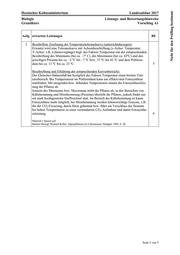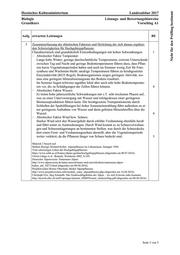 Nicht für den Prüfling bestimmt Hessisches Kultusministerium Landesabitur 2017 Biologie Lösungs- und Bewertungshinweise Grundkurs Vorschlag A1 Seite 2 von 5Aufg. erwartete Leistungen BE 2 Beschriftete Zeichnung der Temperaturtoleranzkurve (unterrichtsbezogen): Erwartet wird eine Toleranzkurve mit Achsenbeschriftung (x-Achse: Temperatur, Y-Achse: z.B. Lebensvorgänge) bzgl. des Faktors Temperatur mit der entsprechenden Beschriftung des Minimums (bei ca. –7° C), des Maximums (bei ca. 42°C) und den jeweiligen Pessima bei ca. –5 °C bis –7 °C bzw. 37 °C bis 42 °C und dem Präferen- dum bei ca. 13 °C bis ca. 23 °C. Beschreibung und Erklärung der entsprechenden Kurvenbereiche: Der Gletscher-Hahnenfuß hat bezüglich des Faktors Temperatur einen breiten Tole- ranzbereich. Bei Temperaturen im Präferendum kann am effektivsten Fotosynthese stattfinden. Mit steigenden bzw. fallenden Temperaturen nimmt die Fotosyntheseleis- tung der Pflanze ab. Jenseits des Minimums bzw. Maximums stirbt die Pflanze ab, in den Bereichen von Kältehemmung und Hitzehemmung (Pessima) überlebt die Pflanze, jedoch findet nur ein stark herabgesetzter Stoffwechsel statt. Im Bereich der Kältehemmung ist kaum Fotosynthese mehr möglich, bei Hitzehemmung werden lebenswichtige Enzyme, z.B. die der CO 2-Fixierung, durch Hitze gehemmt bzw. führt ein Verschluss der Stomata bei hohen Temperaturen zu einer verminderten CO 2-Aufnahme und damit Fotosynthe- seleistung. Material 1 basiert auf: Herbert Reisigl, Richard Keller: Alpenpflanzen im Lebensraum, Stuttgart 1994, S. 20. 5 6