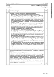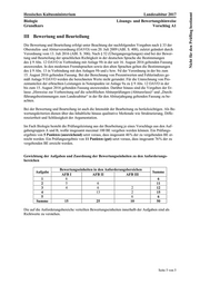 Nicht für den Prüfling bestimmt Hessisches Kultusministerium Landesabitur 2017 Biologie Lösungs- und Bewertungshinweise Grundkurs Vorschlag A1 Seite 5 von 5III Bewertung und Beurteilung Die Bewertung und Beurteilung erfolgt unter Beachtung der nachfolgenden Vorgaben nach § 33 der Oberstufen- und Abiturverordnung (OAVO) vom 20. Juli 2009 (ABl. S. 408), zuletzt geändert durch Verordnung vom 13. Juli 2016 (ABl. S. 306). Nach § 52 (Übergangsregelungen) sind bei der Bewer- tung und Beurteilung der sprachlichen Richtigkeit in der deutschen Sprache die Bestimmungen des § 9 Abs. 12 OAVO in Verbindung mit Anlage 9b in der seit 16. August 2016 geltenden Fassung anzuwenden. In den modernen Fremdsprachen sowie den alten Sprachen gelten die Bestimmungen des § 9 Abs. 13 in Verbindung mit den Anlagen 9b und c bzw. 9d der Verordnung in der bis zum 15. August 2016 geltenden Fassung. Bei der Berechnung von Prozentwerten und Fehlerindizes ge- mäß Anlage 9 OAVO werden die berechneten Werte nicht gerundet. Für die Umrechnung von Pro- zentanteilen der erbrachten Leistungen in Notenpunkte ist Anlage 9a zu § 9 Abs. 12 OAVO in der bis zum 15. August 2016 geltenden Fassung anzuwenden. Darüber hinaus sind die Vorgaben der Er- lasse „Hinweise zur Vorbereitung auf die schriftlichen Abiturprüfungen (Abiturerlass)“ und „Durch- führungsbestimmungen zum Landesabitur“ in der für den Abiturjahrgang geltenden Fassung zu be- achten. Bei der Bewertung und Beurteilung ist auch die Intensität der Bearbeitung zu berücksichtigen. Als Be- wertungskriterien dienen über das Inhaltliche hinaus qualitative Merkmale wie Strukturierung, Diffe- renziertheit und Schlüssigkeit der Argumentation. Im Fach Biologie besteht die Prüfungsleistung aus der Bearbeitung je eines Vorschlags aus den Auf- gabengruppen A und B, wofür insgesamt maximal 100 BE vergeben werden können. Ein Prüfungs- ergebnis von 5 Punkten (ausreichend) setzt voraus, dass insgesamt 46% der zu vergebenden BE er- reicht werden. Ein Prüfungsergebnis von 11 Punkten (gut) setzt voraus, dass insgesamt 76% der zu vergebenden BE erreicht werden. Gewichtung der Aufgaben und Zuordnung der Bewertungseinheiten zu den Anforderungs- bereichen Aufgabe Bewertungseinheiten in den Anforderungsbereichen Summe AFB I AFB II AFB III 1 6 6 2 5 6 11 3 4 6 2 12 4 13 2 15 5 6 6 Summe 15 25 10 50 Die auf die Anforderungsbereiche verteilten Bewertungseinheiten innerhalb der Aufgaben sind als Richtwerte zu verstehen.