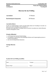 Hessisches Kultusministerium Landesabitur 2017 Biologie Thema und Aufgabenstellung Leistungskurs Vorschlag B2 Seite 1 von 7Hinweise für den Prüfling Auswahlzeit: 45 Minuten Bearbeitungszeit (insgesamt): 240 Minuten Auswahlverfahren Es gibt zwei Aufgabengruppen A und B. Aus jeder Gruppe stehen zwei Vorschläge zur Auswahl, von denen jeweils einer auszuwählen und zu bearbeiten ist. Die beiden nicht ausgewählten Vorschläge müssen am Ende der Auswahlzeit der Aufsicht führenden Lehrkraft zurückgegeben werden. Erlaubte Hilfsmittel 1. ein Wörterbuch der deutschen Rechtschreibung 2. ein eingeführter Taschenrechner (Bei grafikfähigen Rechnern und Computeralgebrasystemen ist ein Reset durchzuführen.) 3. eine Liste der fachspezifischen Operatoren Sonstige Hinweise keine In jedem Fall vom Prüfling auszufüllen Name: Vorname: Prüferin/Prüfer: Datum: