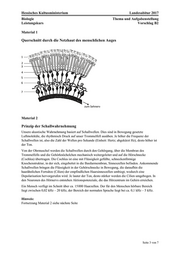 Hessisches Kultusministerium Landesabitur 2017 Biologie Thema und Aufgabenstellung Leistungskurs Vorschlag B2 Seite 3 von 7Material 1 Querschnitt durch die Netzhaut des menschlichen Auges Material 2 Prinzip der Schallwahrnehmung Unsere akustische Wahrnehmung basiert auf Schallwellen. Dies sind in Bewegung gesetzte Luftmoleküle, die rhythmisch Druck auf unser Trommelfell ausüben. Je höher die Frequenz der Schallwellen ist, also die Zahl der Wellen pro Sekunde (Einheit: Hertz; abgekürzt Hz), desto höher ist der Ton. Von der Ohrmuschel werden die Schallwellen durch den Gehörgang, über die Membran des Trommelfells und die Gehörknöchelchen mechanisch weitergeleitet und auf die Hörschnecke (Cochlea) übertragen. Die Cochlea ist eine mit Flüssigkeit gefüllte, schneckenförmige Knochenstruktur, in der sich, eingebettet in die Basilarmembran, Sinneszellen befinden. Ankommende Schallwellen bringen die Flüssigkeit in der Gehörschnecke in Bewegung, die daraufhin die haarähnlichen Fortsätze (Cilien) der empfindlichen Haarsinneszellen umbiegt, wodurch eine Depolarisation hervorgerufen wird. Je lauter der Ton, desto stärker werden die Cilien umgebogen. In den Neuronen des Hörnervs entstehen Aktionspotenziale, die das Hörzentrum im Gehirn erreichen. Ein Mensch verfügt im Schnitt über ca. 15000 Haarzellen. Der für den Menschen hörbare Bereich liegt zwischen 0,02 kHz – 20 kHz, der Bereich der normalen Sprache liegt bei ca. 0,1 kHz – 5 kHz. Hinweis: Fortsetzung Material 2 siehe nächste Seite