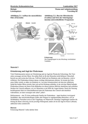 Hessisches Kultusministerium Landesabitur 2017 Biologie Thema und Aufgabenstellung Leistungskurs Vorschlag B2 Seite 2 von 7Verhaltensbiologie Mit den Ohren sehen Aufgaben 1 Ordnen Sie den Nummern in Material 1 die jeweiligen Bestandteile der Netzhaut zu und geben Sie die Einfallsrichtung des Lichts an. Stellen Sie tabellarisch die Funktionsprinzipien der Netzhaut und der Hörschnecke in Bezug auf den adäquaten Reiz, die Rezeption der Reizqualität und die Rezeption der Reizquantität einander gegenüber, sofern sie aus Material 2 zu erkennen sind. (Material 1 und 2) (13 BE) 2 Beschreiben und analysieren Sie die zeitliche Veränderung der Ortungslaute während des Beutefangs der Großen Hufeisennase. (Material 3) (6 BE) 3 Fassen Sie die entscheidenden Unterschiede bezüglich des spezialisierten Hörvermögens der echoortenden Großen Hufeisennase gegenüber einer nicht-echoortenden Fledermaus zusammen und erläutern Sie daran die Spezialisierung der echoortenden Art. (Material 3 und 4) (12 BE) 4 Analysieren und erklären Sie die Reaktion einer fliegenden Fledermaus auf das Phänomen des Dopplereffekts. Begründen Sie, dass die Reaktion der Fledermaus auf dem Schaltprinzip der negativen Rückkopplung beruhen muss. (Material 3 und 5) (12 BE) 5 Erklären Sie, wie eine echoortende Fledermaus ein vor dichtem Blattwerk fliegendes Insekt bei Windstille und bei Wind erkennen kann. (Material 3 und 5) (7 BE)