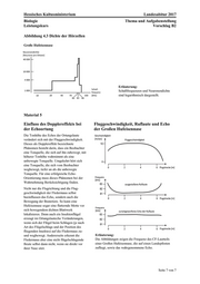 Hessisches Kultusministerium Landesabitur 2017 Biologie Thema und Aufgabenstellung Leistungskurs Vorschlag B2 Seite 7 von 7Abbildung 4.3 Dichte der Hörzellen Große Hufeisennase Erläuterung: Schallfrequenzen und Neuronendichte sind logarithmisch dargestellt. Material 5 Einfluss des Dopplereffekts bei der Echoortung Fluggeschwindigkeit, Ruflaute und Echo der Großen Hufeisennase Die Tonhöhe des Echos der Ortungslaute verändert sich mit der Fluggeschwindigkeit. Dieses als Dopplereffekt bezeichnete Phänomen besteht darin, dass ein Beobachter eine Tonquelle, die sich auf ihn zubewegt, mit höherer Tonhöhe wahrnimmt als eine unbewegte Tonquelle. Umgekehrt hört sich eine Tonquelle, die sich vom Beobachter wegbewegt, tiefer an als die unbewegte Tonquelle. Für eine erfolgreiche Echo- Orientierung muss dieses Phänomen bei der Wahrnehmung Berücksichtigung finden. Nicht nur die Flugrichtung und die Flug- geschwindigkeit der Fledermaus selbst beeinflussen das Echo, sondern auch die Bewegung der Beutetiere. So kann eine Hufeisennase sogar eine flatternde Motte vor sich bewegendem dichten Blattwerk lokalisieren. Denn auch ein Insektenflügel erzeugt im Ortungslautecho Veränderungen, wenn sich der Flügel beim Schlagen (je nach Art des Flügelschlags und der Position des fliegenden Insektes) auf die Fledermaus zu- und wegbewegt. Andererseits erkennt die Fledermaus aber eine nicht flügelschlagende Beute selbst dann nicht, wenn sie direkt vor ihrer Nase sitzt. Erläuterung: Die Abbildungen zeigen die Frequenz des CF-Lautteils einer Großen Hufeisennase, die auf einen Landepfosten zufliegt, sowie das wahrgenommene Echo.