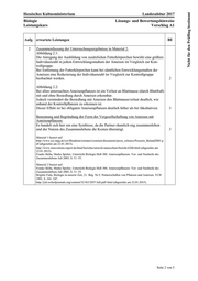 Nicht für den Prüfling bestimmt Hessisches Kultusministerium Landesabitur 2017 Biologie Lösungs- und Bewertungshinweise Leistungskurs Vorschlag A1 Seite 1 von 5I Erläuterungen Aufgabenart materialgebundene Aufgabenstellung Voraussetzungen gemäß Lehrplan und Erlass „Hinweise zur Vorbereitung auf die schriftlichen Abiturprüfungen“ in der für den Abiturjahrgang geltenden Fassung Q2: Ökologie und Stoffwechselphysiologie Strukturierung von Ökosystemen: Übersicht über biotische Faktoren, Konkurrenz, Parasitismus, Sym- biose; Stoffkreisläufe und Energiefluss in Ökosystemen; Methode: Experiment II Lösungshinweise und Bewertungsraster In den nachfolgenden Lösungshinweisen sind alle wesentlichen Gesichtspunkte, die bei der Bearbei- tung der einzelnen Aufgaben zu berücksichtigen sind, konkret genannt und diejenigen Lösungswege aufgezeigt, welche die Prüflinge erfahrungsgemäß einschlagen werden. Selbstverständlich sind jedoch Lösungswege, die von den vorgegebenen abweichen, aber als gleichwertig betrachtet werden können, ebenso zu akzeptieren. Aufg. erwartete Leistungen BE 1 Unterrichtsbezogene Angabe der Definitionen und Beispiele, z.B.: Parasitismus bezeichnet die Beziehung zwischen verschiedenen Arten, bei der eine Art, der Parasit, der anderen Art, dem Wirt, Nahrung und/oder Stoffe entzieht und sie schädigt, in der Regel jedoch ohne sie abzutöten. Mögliches Beispiel: Spulwürmer leben im Darm von Wirbeltieren und schädigen ihren Wirt durch den Entzug energiereicher Stoffe. Konkurrenz bezeichnet die wechselseitige negative Beeinflussung verschiedener Le- bewesen durch gemeinsame Nutzung der gleichen begrenzten Ressourcen. Mögliches Beispiel: verschiedene Pflanzenarten im Wald konkurrieren u.a. um Licht, Mineralstoffe und Wasser. 3 3