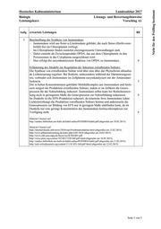 Nicht für den Prüfling bestimmt Hessisches Kultusministerium Landesabitur 2017 Biologie Lösungs- und Bewertungshinweise Leistungskurs Vorschlag A1 Seite 5 von 5III Bewertung und Beurteilung Die Bewertung und Beurteilung erfolgt unter Beachtung der nachfolgenden Vorgaben nach § 33 der Oberstufen- und Abiturverordnung (OAVO) vom 20. Juli 2009 (ABl. S. 408), zuletzt geändert durch Verordnung vom 13. Juli 2016 (ABl. S. 306). Nach § 52 (Übergangsregelungen) sind bei der Bewer- tung und Beurteilung der sprachlichen Richtigkeit in der deutschen Sprache die Bestimmungen des § 9 Abs. 12 OAVO in Verbindung mit Anlage 9b in der seit 16. August 2016 geltenden Fassung anzuwenden. In den modernen Fremdsprachen sowie den alten Sprachen gelten die Bestimmungen des § 9 Abs. 13 in Verbindung mit den Anlagen 9b und c bzw. 9d der Verordnung in der bis zum 15. August 2016 geltenden Fassung. Bei der Berechnung von Prozentwerten und Fehlerindizes ge- mäß Anlage 9 OAVO werden die berechneten Werte nicht gerundet. Für die Umrechnung von Pro- zentanteilen der erbrachten Leistungen in Notenpunkte ist Anlage 9a zu § 9 Abs. 12 OAVO in der bis zum 15. August 2016 geltenden Fassung anzuwenden. Darüber hinaus sind die Vorgaben der Er- lasse „Hinweise zur Vorbereitung auf die schriftlichen Abiturprüfungen (Abiturerlass)“ und „Durch- führungsbestimmungen zum Landesabitur“ in der für den Abiturjahrgang geltenden Fassung zu be- achten. Bei der Bewertung und Beurteilung ist auch die Intensität der Bearbeitung zu berücksichtigen. Als Be- wertungskriterien dienen über das Inhaltliche hinaus qualitative Merkmale wie Strukturierung, Diffe- renziertheit und Schlüssigkeit der Argumentation. Im Fach Biologie besteht die Prüfungsleistung aus der Bearbeitung je eines Vorschlags aus den Auf- gabengruppen A und B, wofür insgesamt maximal 100 BE vergeben werden können. Ein Prüfungs- ergebnis von 5 Punkten (ausreichend) setzt voraus, dass insgesamt 46% der zu vergebenden BE er- reicht werden. Ein Prüfungsergebnis von 11 Punkten (gut) setzt voraus, dass insgesamt 76% der zu vergebenden BE erreicht werden. Gewichtung der Aufgaben und Zuordnung der Bewertungseinheiten zu den Anforderungs- bereichen Aufgabe Bewertungseinheiten in den Anforderungsbereichen Summe AFB I AFB II AFB III 1 6 6 2 5 3 8 3 4 11 15 4 11 2 13 5 8 8 Summe 15 25 10 50 Die auf die Anforderungsbereiche verteilten Bewertungseinheiten innerhalb der Aufgaben sind als Richtwerte zu verstehen.