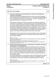 Nicht für den Prüfling bestimmt Hessisches Kultusministerium Landesabitur 2017 Biologie Lösungs- und Bewertungshinweise Leistungskurs Vorschlag A1 Seite 2 von 5Aufg. erwartete Leistungen BE 2 Zusammenfassung der Untersuchungsergebnisse in Material 2: Abbildung 2.1: Die Anregung der Ausbildung von zusätzlichen Futterkörperchen bewirkt eine größere Individuenzahl in jedem Entwicklungsstadium der Ameisen im Vergleich zur Kon- trollgruppe. Bei Entfernung der Futterkörperchen kann bei sämtlichen Entwicklungsstadien der Ameisen eine Reduzierung der Individuenzahl im Vergleich zur Kontrollgruppe beobachtet werden. Abbildung 2.2: Bei allen untersuchten Ameisenpflanzen ist ein Verlust an Blattmasse (durch Blattfraß) mit und ohne Besiedlung durch Ameisen erkennbar. Jedoch vermindert die Besiedlung mit Ameisen den Blattmasseverlust deutlich, wie anhand der Kontrollpflanzen zu erkennen ist. Dieser Effekt ist bei obligaten Ameisenpflanzen deutlich höher als bei fakultativen. Benennung und Begründung der Form der Vergesellschaftung von Ameisen mit Ameisenpflanzen: Es handelt sich hier um eine Symbiose, da die Partner räumlich eng zusammenleben und der Nutzen des Zusammenlebens die Kosten übersteigt. Material 1 basiert auf: http://www.ice.mpg.de/ext/fileadmin/extranet/common/documents/press_releases/Pressem_Boland2001.p df (abgerufen am 22.01.2015). http://www.innovations-report.de/html/berichte/umwelt-naturschutz/bericht-6286.html (abgerufen am 22.01.2015). Frauke Skiba, Marko Spieler, Unterricht Biologie Heft 306: Ameisenpflanzen: Vor- und Nachteile des Zusammenlebens Juli 2005, S. 51–55. Material 2 basiert auf: Frauke Skiba, Marko Spieler, Unterricht Biologie Heft 306: Ameisenpflanzen: Vor- und Nachteile des Zusammenlebens Juli 2005, S. 51–55. Brigitte Fiala, Biologie in unserer Zeit, 21. Jhrg. Nr.5: Partnerschaften von Pflanzen und Ameisen, VCH 1991, S. 241–247. http://jxb.oxfordjournals.org/content/52/363/2057.full.pdf+html (abgerufen am 22.01.2015). 2 3 3