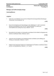 Hessisches Kultusministerium Landesabitur 2017 Biologie Thema und Aufgabenstellung Leistungskurs Vorschlag A1 Seite 1 von 8Hinweise für den Prüfling Auswahlzeit: 45 Minuten Bearbeitungszeit (insgesamt): 240 Minuten Auswahlverfahren Es gibt zwei Aufgabengruppen A und B. Aus jeder Gruppe stehen zwei Vorschläge zur Auswahl, von denen jeweils einer auszuwählen und zu bearbeiten ist. Die beiden nicht ausgewählten Vorschläge müssen am Ende der Auswahlzeit der Aufsicht führenden Lehrkraft zurückgegeben werden. Erlaubte Hilfsmittel 1. ein Wörterbuch der deutschen Rechtschreibung 2. ein eingeführter Taschenrechner (Bei grafikfähigen Rechnern und Computeralgebrasystemen ist ein Reset durchzuführen.) 3. eine Liste der fachspezifischen Operatoren Sonstige Hinweise keine In jedem Fall vom Prüfling auszufüllen Name: Vorname: Prüferin/Prüfer: Datum: