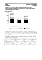 Hessisches Kultusministerium Landesabitur 2017 Biologie Thema und Aufgabenstellung Leistungskurs Vorschlag A1 Seite 3 von 8Material 1 Ameisenpflanzen In den Tropen haben zahlreiche Pflanzen Allianzen mit unterschiedlichsten Insekten entwickelt, die sie vor Fressfeinden schützen. In Südostasien ist die Baumgattung Macaranga beheimatet. Bei diesen Bäumen handelt es sich um so genannte Ameisenpflanzen. An Pflanzen der Gattung Macaranga leben Ameisen der Gattung Crematogaster. Diese entfernen Pilzsporen und Eier anderer Insekten, greifen Raupen an und verdrängen Käfer von den Pflanzen. Außerdem kappen sie die Ranken von Schlingpflanzen, sobald diese den Wirtsbaum berühren. Die Ameisen werden mit extrafloralem Nektar aus extrafloralen Nektarien belohnt. Dies sind Nektardrüsen, die sich im Gegensatz zu floralen Nektarien außerhalb der Blüte meist an den Laubblättern befinden und durch die die Pflanzen Nektar (= wässerige Zuckerlösung) ausscheiden. Viele Macaranga-Arten produzieren zusätzlich noch so genannte Futterkörperchen, von denen sich hauptsächlich die den Baum besiedelnden Ameisen ernähren. Aber auch andere räuberische Insekten und Nektarkonsumenten werden aus der Umgebung angelockt. Extraflorale Nektarien und Futterkörperchen werden nicht zur Anlockung von bestäubenden Insekten genutzt. Futterkörperchen weisen einen relativ hohen Gehalt an Lipiden und Proteinen auf. Für deren Produktion werden bis zu 7% des im Boden verfügbaren Stickstoffs und mehr als 5% der aus der Fotosynthese gewonnen Energie aufgewendet. Man unterscheidet zwei Typen von Ameisenpflanzen: Fakultative Ameisenpflanzen sind solche, die nur zum Nahrungserwerb besucht werden; als obligate Ameisenpflanzen bezeichnet man Arten, die dauerhaft von Ameisen bewohnt werden. Material 2 Untersuchungen an Ameisenpflanzen und deren Besiedlern In einem Fütterungsexperiment untersuchte man das Verhalten von Ameisen, die eine obligate Ameisenpflanze besiedelten. In einem Wahlversuch bot man den Besiedlern Insekteneier, Insekten und Futterkörperchen an. Dabei konnte man beobachten, dass die Besiedler (Ameisen) nahezu alle Insekteneier von der Pflanze entfernten und Insekten durch Bisse vertrieben. Futterkörperchen dienten zu 100% als Nahrungsquelle. In einem zweiten Versuch wurde bei 30 Ameisenpflanzen die Ausbildung zusätzlicher Futterkörper- chen stimuliert, bei weiteren 30 Ameisenpflanzen wurden dagegen die Futterkörperchen entfernt. Im Kontrollversuch wurden die Pflanzen nicht manipuliert. Nach 30 Tagen wurde die Anzahl der Ameisen und die Altersstruktur der Ameisenpopulation bestimmt. Das Ergebnis ist in Abbildung 2.1 dargestellt.