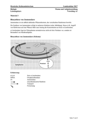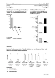 Hessisches Kultusministerium Landesabitur 2017 Biologie Thema und Aufgabenstellung Leistungskurs Vorschlag A1 Seite 2 von 8Ökologie und Stoffwechselphysiologie Ameisenpflanzen Aufgaben 1 Geben Sie je eine Definition sowie jeweils ein Beispiel für die interspezifischen Beziehungen „Parasitismus“ und „Konkurrenz“ an. (6 BE) 2 Fassen Sie die Ergebnisse der Untersuchungen in den Abbildungen 2.1 und 2.2 zusammen. Benennen und begründen Sie die Form der Vergesellschaftung von Ameisen mit Ameisenpflanzen der Gattung Macaranga. (Material 1 und 2) (8 BE) 3 Beschreiben Sie die Synthese von Jasmonsäure und erläutern Sie das Modell zur Regulation der Sekretion extrafloralen Nektars. (Material 3 und 4) (15 BE) 4 Analysieren Sie die Ergebnisse der Freilandexperimente im Hinblick auf die Bildung und Wirkung von Jasmonsäure. (Material 3, 4 und 5) (13 BE) 5 Erklären Sie die biologische Funktion der Veränderbarkeit der Produktion extrafloralen Nektars und der von Futterkörperchen. (Material 1, 3, 4, 5 und 6) (8 BE)