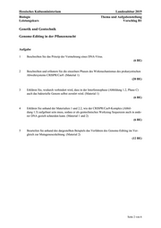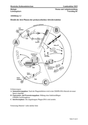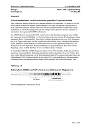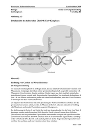 Hessisches Kultusministerium Landesabitur 2019 Biologie Thema und Aufgabenstellung Leistungskurs Vorschlag B1 Seite 2 von 6Genetik und Gentechnik Genome-Editing in der Pflanzenzucht Aufgabe 1 Beschreiben Sie das Prinzip der Vermehrung eines DNA-Virus. (6 BE) 2 Beschreiben und erläutern Sie die einzelnen Phasen des Wirkmechanismus des prokaryotischen Abwehrsystems CRISPR/Cas9. (Material 1) (20 BE) 3 Erklären Sie, wodurch verhindert wird, dass in der Interferenzphase (Abbildung 1.2, Phase C) auch das bakterielle Genom selbst zerstört wird. (Material 1) (6 BE) 4 Erklären Sie anhand der Materialien 1 und 2.2, wie der CRISPR/Cas9-Komplex (Abbil- dung 1.3) aufgebaut sein muss, sodass er als gentechnisches Werkzeug Sequenzen auch in ande- rer DNA gezielt schneiden kann. (Material 1 und 2) (6 BE) 5 Beurteilen Sie anhand des dargestellten Beispiels das Verfahren des Genome-Editing im Ver- gleich zur Mutagenesezüchtung. (Material 2) (12 BE)