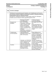 Nicht für den Prüfling bestimmt Hessisches Kultusministerium Landesabitur 2019 Biologie Lösungs- und Bewertungshinweise Leistungskurs Vorschlag A1 Seite 3 von 6Aufg. erwartete Leistungen BE 2 Tabellarische Zusammenfassung der Symptome, der Veränderungen im Nervensys- tem und deren Ursachen bezüglich der Huntington-Krankheit. Gegenüberstellung der entsprechenden Fakten zur Alzheimer-Demenz: Innerhalb der vorgegebenen Kategorien sollen analoge Aspekte der Huntington- Krankheit und der Alzheimer-Demenz gegenübergestellt werden. Huntington-Krankheit (materialbezogen) Alzheimer-Demenz (unterrichtsabhängig) Symptome der Krankheit ab ca. 30-50 Jahren; Frühstadium: zunehmend stärker werdende unwill- kürliche Bewegungen, Schluck- und Sprechstö- rungen; psychische Verän- derungen; Spätstadium: zunehmende Muskelsteifheit, Demenz eher später, ab ca. 65 Jah- ren; keine motorischen Ein- schränkungen, aber eben- falls zunehmende Demenz und psychische Verände- rungen Veränderungen im Nervensystem Aggregatbildung des Huntingtin-Proteins inner- halb von Neuronen; Absterben von GABA füh- renden Neuronen des Stri- atums, schließlich Ab- nahme der Gehirnmasse Plaque-Bildung des β- Amyloid-Proteins, im Ge- gensatz zur Huntington- Krankheit außerhalb der Neurone, sowie die Bil- dung intrazellulärer Neu- rofibrillen; ebenfalls Absterben von Neuronen sowie Verände- rung der neuronalen Struk- tur des Gehirns Ursachen autosomal dominante Mu- tation im Huntingtin-Gen; Bildung anormaler Huntingtin-Proteine in einigen Fällen Mutatio- nen verschiedener Gene; Störung des Amyloid-Ab- baus; Störung der Funk- tion der Tau-Proteine 4 4 3