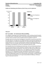 Hessisches Kultusministerium Landesabitur 2021 Biologie Thema und Aufgabenstellung Grundkurs Vorschlag A Seite 2 von 9 Honigbienen – Varroamilben – Pontischer Honig (Ökologische und stoffwechselphysiologische Zusammenhänge, Neurobiologie und Verhaltens- biologie) Aktuell ist das Insektensterben häufig Thema in den Medien, und es wird schon über eine „Bestäuber- krise“ diskutiert. Hierbei wird die Honigbiene Apis mellifera oft synonym für alle bestäubenden Insek- ten verwendet. Für die Gesundheit der Honigbienen ist es entscheidend, dass sie Krankheitserreger erfolgreich be- kämpfen können. In diesem Zusammenhang werden die Varroa-Milbe und die von ihr übertragenen Bienenkrankheiten als ein zentraler Faktor für das Sterben von Bienenvölkern angesehen. Honig, ein von Honigbienen zur eigenen Nahrungsvorsorge erzeugtes und vom Menschen genutztes Lebensmittel, kann aufgrund bestimmter aus Nahrungspflanzen der Bienen stammender Wirkstoffe unter Umständen eine gesundheitliche Gefährdung darstellen. Aufgaben Honigbiene und Varroamilbe 1 Geben Sie die Definitionen für Biotop und Biozönose an und nennen Sie je zwei Beispiele für charakteristische abiotische und biotische Ökofaktoren. (8 BE) 2 Erläutern Sie die wechselseitige Beziehung zwischen Honigbienen und Apfelbäumen. Beschrei- ben Sie die Unterschiede zwischen den drei Apfelsorten hinsichtlich des Ertrags und entwickeln Sie eine Hypothese für die Erträge ohne Honigbienenbeflug. (Material 1 und 2) (11 BE) 3 Erklären Sie den Einfluss der Varroamilbe auf die Sterblichkeit des Bienenvolkes. (Material 1 und 3) (8 BE) 4 Fassen Sie die Versuchsergebnisse zum Putzverhalten der asiatischen und der europäischen Honigbiene zusammen und deuten Sie diese. (Material 3 und 4) (15 BE) 5 Beurteilen Sie den Vorschlag, bei der Apfelblüte gezielt solitäre Bienenarten, wie z.B. die Gehörnte Mauerbiene, zum Einsatz zu bringen, anhand von vier unterschiedlichen Aspekten. (Material 1, 2 und 5) (8 BE) Fortsetzung der Aufgabenstellung auf der folgenden Seite