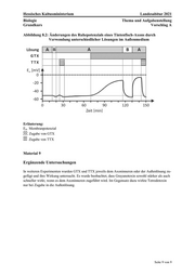Hessisches Kultusministerium Landesabitur 2021 Biologie Thema und Aufgabenstellung Grundkurs Vorschlag A Seite 8 von 9 Material 7 Ionenkonzentrationen und Membranpermeabilitäten eines Neurons während des Ruhepotenzials am unerregten Riesenaxon eines Tintenfisches Ion Na+ K+ Cl− organi- sche Anionen intrazelluläre Konzentration [mmol/l] 50 400 108 460 extrazelluläre Konzentration [mmol/l] 440 20 560 0 relativer Permeabilitätskoeffizient 0,04 1 0,44 0 Erläuterung: Relativer Permeabilitätskoeffizient: Maß für die Durchlässigkeit einer Membran für bestimmte Ionen. Dieser gibt das Verhältnis der Permeabilitäten für Na+ und Cl− zur Permeabilität von K+ an. Material 8 Molekulare Ursache der Vergiftungserscheinungen durch Grayanotoxin Um die molekularen Ursachen zu identifizieren, welche die beschriebenen Wirkungen im Nervensys- tem des Menschen auslösen, wurden Riesenaxone des Tintenfischs Loligo pealeii präpariert und Lö- sungen unterschiedlicher Zusammensetzung ausgesetzt. In den Experimenten wurde sichergestellt, dass die Ausbildung von Aktionspotenzialen blockiert wird, ohne dass das Ruhepotenzial beeinflusst wird. Das Axoninnere wurde konstant von einer Standard-Innenraumflüssigkeit durchströmt, während die Außenlösungen entsprechend den in der Grafik angegebenen Verhältnissen variiert wurden. Die erhal- tenen Membranpotenzialänderungen wurden aufgezeichnet. Neben den in der Tabelle verwendeten Außenlösungen wurden zu unterschiedlichen Zeiten für bestimmte zeitliche Intervalle Tetrodotoxin (TTX) beziehungsweise Grayanotoxin (GTX) zugesetzt. Tetrodotoxin ist ein Wirkstoff, der spannungsabhängige Natriumionenkanäle so blockiert, dass keine Natriumionen mehr hindurch diffundieren können. Abbildung 8.1: Konzentrationen ausgewählter Ionen der im Versuch verwende- ten Lösungen Lösung Inhaltsstoffe Außenlösungen Innenlösung A B C Meerwasser [mmol/l] natriumarmes Meerwasser [mmol/l] Standard Innenraum- Flüssigkeit [mmol/l] Na+ 449 1 50 K+ 10 10 350 organische Anionen 0 0 320 Hinweis: Osmotische Vorgänge sind für die Lösung der Aufgabe nicht relevant.