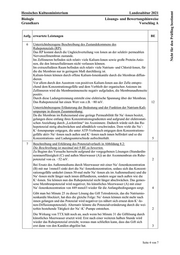 Nicht für den Prüfling bestimmt Hessisches Kultusministerium Landesabitur 2021 Biologie Lösungs- und Bewertungshinweise Grundkurs Vorschlag A Seite 6 von 7III Bewertung und Beurteilung Die Bewertung und Beurteilung erfolgt unter Beachtung der nachfolgenden Vorgaben nach § 33 der Oberstufen- und Abiturverordnung (OAVO) in der jeweils geltenden Fassung. Bei der Bewertung und Beurteilung der sprachlichen Richtigkeit in der deutschen Sprache sind die Bestimmungen des § 9 Abs. 12 OAVO in Verbindung mit Anlage 9b anzuwenden. In den modernen Fremdsprachen ist nach den Bestimmungen des § 9 Abs. 13 OAVO in Verbindung mit dem „Erlass zur Bewertung und Beurteilung von schriftlichen Arbeiten in allen Grund- und Leis- tungskursen der neu beginnenden und fortgeführten modernen Fremdsprachen in der gymnasialen Oberstufe, dem beruflichen Gymnasium, dem Abendgymnasium und dem Hessenkolleg“ vom 7. Au- gust 2020 (ABl. S. 519) die sprachliche Leistung kriteriengeleitet zu bewerten. Bei der Bewertung und Beurteilung der Übersetzungsleistung in den Fächern Latein und Altgriechisch sind die Bestimmungen des § 9 Abs. 14 OAVO in Verbindung mit Anlage 9c anzuwenden. Der Fehlerindex ist nach Anlage 9b zu § 9 Abs. 12 OAVO zu berechnen. Für die Ermittlung der Punkte nach Anlage 9a zu § 9 Abs. 12 OAVO sowie Anlage 9c zu § 9 Abs. 14 OAVO wird jeweils der ganzzahlige nicht gerundete Prozentsatz bzw. Fehlerindex zugrunde gelegt. Darüber hinaus sind die Vorgaben der Erlasse „Hinweise zur Vorbereitung auf die schriftlichen Abi- turprüfungen (Abiturerlass)“ und „Durchführungsbestimmungen zum Landesabitur“ in der für den Abiturjahrgang geltenden Fassung zu beachten. Bei der Bewertung und Beurteilung ist auch die Intensität der Bearbeitung zu berücksichtigen. Als Be- wertungskriterien dienen über das Inhaltliche hinaus qualitative Merkmale wie Strukturierung, Diffe- renziertheit, sprachliche Gestaltung und Schlüssigkeit der Argumentation. Ein Prüfungsergebnis von 5 Punkten (ausreichend) setzt voraus, dass insgesamt 45% der zu verge- benden BE erreicht werden. Ein Prüfungsergebnis von 11 Punkten (gut) setzt voraus, dass insgesamt 75% der zu vergebenden BE erreicht werden. Gewichtung der Aufgaben und Zuordnung der Bewertungseinheiten zu den Anforderungsbereichen Aufgabe Bewertungseinheiten in den AnforderungsbereichenSumme AFB I AFB II AFB III 1 8 8 2 4 7 11 3 8 8 4 3 10 2 15 5 8 8 6 12 5 17 7 3 12 7 22 8 4 4 9 4 3 7 Summe 30 50 20 100 Die auf die Anforderungsbereiche verteilten Bewertungseinheiten innerhalb der Aufgaben sind als Richtwerte zu verstehen.