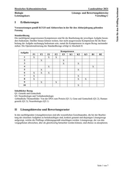 Nicht für den Prüfling bestimmt Hessisches Kultusministerium Landesabitur 2021 Biologie Lösungs- und Bewertungshinweise Leistungskurs Vorschlag C Seite 1 von 7I Erläuterungen Voraussetzungen gemäß KCGO und Abiturerlass in der für den Abiturjahrgang geltenden Fassung Standardbezug Die nachfolgend ausgewiesenen Kompetenzen sind für die Bearbeitung der jeweiligen Aufgabe beson- ders bedeutsam. Darüber hinaus können weitere, hier nicht ausgewiesene Kompetenzen für die Bear- beitung der Aufgabe nachrangig bedeutsam sein, zumal die Kompetenzen in engem Bezug zueinander stehen. Die Operationalisierung des Standardbezugs erfolgt in Abschnitt II. Aufgabe Kompetenzen F1 F2 E1 E2 E3 K1 K2 K3 B1 B2 1 X X X 2 X X 3 X X 4 X X 5 X X 6 X X X 7 X X 8 X X X 9 X X 10 X Inhaltlicher Bezug Q1: Genetik und Gentechnik Q3: Neurobiologie und Verhaltensbiologie verbindliche Themenfelder: Von der DNA zum Protein (Q1.1), Gene und Gentechnik (Q1.2), Human- genetik (Q1.3), Neurobiologie (Q3.1) II Lösungshinweise und Bewertungsraster In den nachfolgenden Lösungshinweisen sind alle wesentlichen Gesichtspunkte, die bei der Bearbei- tung der einzelnen Aufgaben zu berücksichtigen sind, konkret genannt und diejenigen Lösungswege aufgezeigt, welche die Prüflinge erfahrungsgemäß einschlagen werden. Lösungswege, die von den vorgegebenen abweichen, aber als gleichwertig betrachtet werden können, sind ebenso zu akzeptieren.