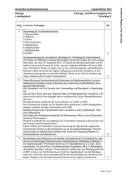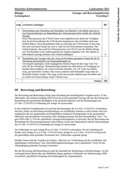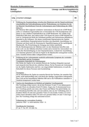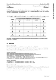 Nicht für den Prüfling bestimmt Hessisches Kultusministerium Landesabitur 2021 Biologie Lösungs- und Bewertungshinweise Leistungskurs Vorschlag C Seite 6 von 7Ein Prüfungsergebnis von 5 Punkten (ausreichend) setzt voraus, dass insgesamt 45% der zu verge- benden BE erreicht werden. Ein Prüfungsergebnis von 11 Punkten (gut) setzt voraus, dass insgesamt 75% der zu vergebenden BE erreicht werden. Gewichtung der Aufgaben und Zuordnung der Bewertungseinheiten zu den Anforderungsbereichen Aufgabe Bewertungseinheiten in den AnforderungsbereichenSumme AFB I AFB II AFB III 1 8 8 2 8 4 12 3 3 4 7 4 8 5 13 5 4 2 6 6 8 8 7 6 6 8 5 20 25 9 8 8 10 2 5 7 Summe 30 50 20 100 Die auf die Anforderungsbereiche verteilten Bewertungseinheiten innerhalb der Aufgaben sind als Richtwerte zu verstehen. IV Quellen Material 1 basiert auf: URL: http://tuprints.ulb.tu-darmstadt.de/390/1/Diss-Altwein.pdf (abgerufen am 07.05.2019). URL: http://www.dma.ufg.ac.at/app/link/Grundlagen%3AAllgemeine/module/16457?step=2 (abgerufen am 04.06.2019). Regine Klinke: Nachts sind alle Katzen grau: Unterricht Biologie, Heft 288/ 289, Friedrich Verlag, Okt./ Nov. 2003, S. 21. Werner A. Müller et al.: Tier und Humanphysiologie, 5. Auflage, Berlin, 2015, S. 579–583. Material 2 basiert auf: Joachim Becker et al.: Biosphäre, Sekundarstufe II Neurobiologie, Berlin, 2017, S. 75. Joachim Becker et al.: Biosphäre, Sekundarstufe II Neurobiologie Klausurenheft, Berlin, 2016, S. 39. Andrea Erdmann et al.: Grüne Reihe Neurobiologie, Braunschweig, 2005, S. 45. Neil A. Campbell, Jane B. Reece: Biologie, 8. Auflage, München, 2011, S. 1481. Michael Walory, Elsbeth Westendorf-Bröring: Biologie heute SII, Lehrermaterialien Teil 1, Braunschweig, 2012, S. 187. Dr. Mathias Ebel et al.: Grüne Reihe Neurobiologie, Braunschweig, 2015, S. 74–76. Material 3 basiert auf: Andrea Erdmann et al.: Grüne Reihe Neurobiologie, Braunschweig, 2005, S. 45. Dr. Mathias Ebel et al.: Grüne Reihe Neurobiologie, Braunschweig, 2015, S. 74–76. Material 4 basiert auf: URL: http://apickert.ch/farbenblindheit.pdf (abgerufen am 05.05.2019). URL: https://www.uni-muenchen.de/aktuelles/medien/einsichten/archiv/2010/naturwissenschaften/licht_2010.pdf (abgerufen am 05.05.2019). Joachim Becker et al.: Biosphäre, Sekundarstufe II Neurobiologie Klausurenheft, Berlin, 2016, S. 39. URL: http://juser.fz-juelich.de/record/26448/files/Juel_4037_Traenkner.pdf (abgerufen am 26.06.2020).