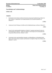 Hessisches Kultusministerium Landesabitur 2020 Biologie Thema und Aufgabenstellung Grundkurs Vorschlag A1 Seite 2 von 5Neurobiologie und Verhaltensbiologie Coffee to fly Aufgaben 1 Beschreiben Sie die beiden Lernformen klassische und operante Konditionierung. Ordnen Sie den in Material 1 dargestellten Lernvorgang begründet einer Konditionierungsform zu. (Material 1) (13 BE) 2 Analysieren Sie die Wirkung von Koffein auf die Gedächtnisleistung von Bienen. (Material 1) (9 BE) 3 Fassen Sie die experimentellen Ergebnisse in Material 2 zusammen und deuten Sie diese im Zusammenhang mit Material 1. Stellen Sie mögliche Auswirkungen auf die Sammelaktivität des gesamten Bienenvolks dar. (Material 1 und 2) (13 BE) 4 Untersuchen Sie die unterschiedlichen Strategien von Blütenpflanzen zur Bestäubung durch Bienen unter Kosten-Nutzen-Aspekten und beurteilen Sie mögliche Folgen für ein Bienenvolk. (Material 1, 2 und 3) (15 BE)