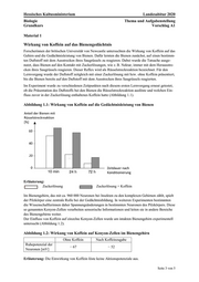 Hessisches Kultusministerium Landesabitur 2020 Biologie Thema und Aufgabenstellung Grundkurs Vorschlag A1 Seite 3 von 5Material 1 Wirkung von Koffein auf das Bienengedächtnis Forscherinnen der britischen Universität von Newcastle untersuchten die Wirkung von Koffein auf das Gehirn und die Gedächtnisleistung von Bienen. Dafür lernten die Bienen zunächst, auf einen bestimm- ten Duftstoff mit dem Ausstrecken ihres Saugrüssels zu reagieren. Dabei wurde die Tatsache ausge- nutzt, dass Bienen auf den Kontakt mit Zuckerlösungen, wie z. B. Nektar, immer mit dem Herausstre- cken ihres Saugrüssels reagieren. Dieser Reflex wird als Rüsselstreckreaktion bezeichnet. Für den Lernvorgang wurde der Duftstoff zeitgleich mit einer Zuckerlösung mit bzw. ohne Koffein präsentiert, bis die Bienen bereits auf den Duftstoff mit dem Ausstrecken ihres Saugrüssels reagierten. Im Experiment wurde zu verschiedenen Zeitpunkten nach diesem ersten Lernvorgang erneut getestet, ob die Präsentation des Duftstoffs bei den Bienen die Rüsselstreckreaktion auslöste und welchen Ein- fluss zuvor in der Zuckerlösung enthaltenes Koffein hatte (Abbildung 1.1). Abbildung 1.1: Wirkung von Koffein auf die Gedächtnisleistung von Bienen Erläuterung: Zuckerlösung Zuckerlösung + Koffein Im Bienengehirn, das mit ca. 960 000 Neuronen bei Insekten zu den komplexen Gehirnen zählt, spielt der Pilzkörper eine zentrale Rolle bei der Gedächtnisbildung. In weiteren Experimenten bestimmten die Wissenschaftlerinnen daher Spannungsänderungen in bestimmten Neuronen des Pilzkörpers. Diese so genannten Kenyon-Zellen verarbeiten sensorische Informationen und leiten sie in andere Bereiche des Bienengehirns weiter. Der Einfluss von Koffein auf einzelne Kenyon-Zellen wurde am intakten Bienengehirn experimentell untersucht (Abbildung 1.2). Abbildung 1.2: Wirkung von Koffein auf Kenyon-Zellen im Bienengehirn Ohne Koffein Nach Koffeinzugabe Ruhepotenzial der Neuronen [mV] − 67 − 52 Erläuterung: Die Einwirkung von Koffein löste keine Aktionspotenziale aus.