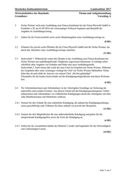 Hessisches Kultusministerium Landesabitur 2017 Wirtschaftslehre des Haushalts Thema und Aufgabenstellung Grundkurs Vorschlag A Seite 3 von 5 2 Niclas Weimar wird seine Ausbildung zum Fitness-Kaufmann bei der Firma Physiofit GmbH in Frankfurt a. M. am 01.09.2016 mit viermonatiger Probezeit beginnen und überprüft die Angaben im Ausbildungsvertrag. 2.1 Geben Sie die Formvorschrift sowie sechs Mindestangaben eines Ausbildungsvertrags an. (8 BE) 2.2 Erläutern Sie jeweils sechs Pflichten für die Firma Physiofit GmbH und für Niclas Weimar, die durch den Abschluss eines Ausbildungsvertrags entstehen. (12 BE) 2.3 Sachverhalt 1: Während der ersten drei Monate in der Ausbildung zum Fitness-Kaufmann hat Niclas Weimar nur ausbildungsfremde Tätigkeiten zugewiesen bekommen. Er kündigt sofort schriftlich ohne Angaben von Gründen und findet eine neue Ausbildungsstelle. Sachverhalt 2: Nach einem Jahr sucht der neue Chef ein Gespräch mit Niclas Weimar. Während des Gesprächs über seine Leistungen verlangt der Chef von Niclas Weimar Mehrarbeit. Niclas lehnt dies ab und erhält als Antwort von seinem Chef: „Du bist gekündigt!“ Überprüfen Sie die beiden Sachverhalte auf die Kündigungsmöglichkeiten und deren Wirksam- keit. (6 BE) 2.4 Für Arbeitnehmerinnen und Arbeitnehmer ist der Arbeitsplatz Grundlage zur Sicherung der materiellen und sozialen Existenz. Aus diesem Grund soll das Kündigungsschutzgesetz Arbeit- nehmerinnen und Arbeitnehmer vor willkürlichen Kündigungen durch den Arbeitgeber mit über zehn Mitarbeiterinnen und Mitarbeiter schützen. 2.4.1 Nennen Sie drei Gründe für eine ordentliche Kündigung, die anhand des Kündigungsschutzge- setzes gerechtfertigt sind. Erläutern Sie diese anhand von jeweils drei Beispielen. (12 BE) 2.4.2 Nennen Sie drei Möglichkeiten für eine außerordentliche Kündigung und geben Sie die entsprechende Kündigungsfrist sowie die Form der Kündigung an. (6 BE) 2.4.3 Geben Sie die wesentlichen Inhalte des Material 2 wieder und begründen Sie die Notwendigkeit zum Lebenslangen Lernen. (10 BE)