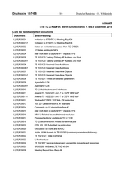 Drucksache 18/7466 – 48 – Deutscher Bundestag – 18. Wahlperiode Anlage 5 ETSI TC LI Rap# 35; Den Haag (Niederlande); 25. bis 26. August 2015 Liste der bereitgestellten Dokumente Dokument Beschreibung LI(15)R35001 Notes on IMS update for IMS FAQ LI(15)R35002 DTS 103 120 - Output from Svalbard (changes marked) LI(15)R35003 DTS 103 120 - Output from Svalbard (clean) LI(15)R35004 DTS 103 120 - Editorial corrections and changes LI(15)R35004r1 DTS 103 120 - Editorial corrections and changes LI(15)R35004r2 DTS 103 120 - Editorial corrections and changes LI(15)R35005 DTS 103 120 - To Do List LI(15)R35005r1 DTS 103 120 - To Do List LI(15)R35005r2 DTS 103 120 - To Do List LI(15)R35006 DTS 103 120 - XSD Schemas LI(15)R35006r1 DTS 103 120 - XSD Schemas LI(15)R35007 DTS 103 120 - Exec Summary Intro and Scope LI(15)R35007r1 DTS 103 120 - Exec Summary Intro and Scope LI(15)R35008 DTS 103 221 version 0.0.2 LI(15)R35008r1 DTS 103 221 version 0.0.2 LI(15)R35009 TS 102 232 Draft CR - WLAN location LI(15)R35009r1 TS 102 232 Draft CR - WLAN location LI(15)R35010 TS 102 232 Draft CR IMS Call Direction LI(15)R35010r1 TS 102 232 Draft CR IMS Call Direction LI(15)R35011 DTS 103 120 - Non-editorial changes LI(15)R35011r1 DTS 103 120 - Non-editorial changes LI(15)R35011r2 DTS 103 120 - Non-editorial changes LI(15)R35012 TS 103 280 - To Do List LI(15)R35012r1 TS 103 280 - To Do List LI(15)R35013 DTS 103 120 - Revised Annex B LI(15)R35013r1 DTS 103 120 - Revised Annex B LI(15)R35014 Agenda for LI Rapp#35 LI(15)R35015 IMS FAQ LI(15)R35016 Suggestion for discussion on X1 standard DTS 103 221 LI(15)R35017 Requirements for X3 (DTS 103 221-3) LI(15)R35018 DTS 103 120 - Output from Den Haag - changes marked