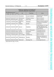 Drucksache 19/1477 – 48 – Deutscher Bundestag – 19. Wahlperiode Vorabfassung - wird durch die lektorierte Version ersetzt. Weitere personalwerbliche Maßnahmen außerhalb militärischer Liegenschaften Durchführungszeitraum Art der Maß- PLZ Ort Örtlichkeit Anlass von bis nahme Regensburg 12.05.2018 13.05.2018 93049 Regensburg Infineon-Parkplatz InfoTruck Marathon Unternehmer- 15.05.2018 15.05.2018 95028 Hof Hochschule Kofferstand börse Berufsinforma- 17.05.2018 17.05.2018 21706 Drochtersen Gesamtschule Kofferstand tionstage Absolventen- 17.05.2018 17.05.2018 80335 München Postpalast Kofferstand kongress 17.05.2018 17.05.2018 99974 Mühlhausen Agentur für Arbeit Vortragsreihe Kofferstand White Sands 18.05.2018 21.05.2018 26548 Norderney Nordstrand Info-Mobil Festival Dessau-Roß- 19.05.2018 20.05.2018 06846 Flugplatz Flugplatzfest KarriereMobil lau 19.05.2018 21.05.2018 18057 Rostock Neuer Markt MV – Tag InfoTruck 20.05.2018 21.05.2018 56459 Ailertchen Flugplatz Flugplatzfest Kofferstand Berufsinforma- 25.05.2018 26.05.2018 31812 Bad Pyrmont Sporthalle Südstraße Kofferstand tionstage 26.05.2018 26.05.2018 95100 Selb Ludwigsstraße Bürgerfest KarriereMobil Ortsteilzentrum Alt-Ru- Rudower Früh- 26.05.2018 27.05.2018 12357 Berlin Info-Mobil dow lingsmeile MKW-Aktions- 26.05.2018 27.05.2018 26629 Großefehn Entsorgungszentrum InfoTruck tage Ausstellungsgelände Süd- 28.05.2018 30.05.2018 34497 Korbach Hessentag InfoTruck ring Flugplatzfest 01.06.2018 03.06.2018 01917 Kamenz Flugplatz 100-jähriges Info-Mobil Bestehen Rheinland- 01.06.2018 03.06.2018 67549 Worms Stadtzentrum Info-Mobil Pfalz-Tag 02.06.2018 02.06.2018 53123 Bonn Stadteil Hardtberg Derletalfest Info-Mobil 03.06.2018 03.06.2018 06886 Wittenberg Arthur Lambert Stadion Leukemielauf KarriereMobil Bad Salzun- 07.06.2018 07.06.2018 36433 Agentur für Arbeit Vortragsreihe Kofferstand gen Braun- Firmenkontakt- 07.06.2018 07.06.2018 38102 Technikakademie Kofferstand schweig börse Städtische Saalbetriebe Ausbildungs- 07.06.2018 07.06.2018 58706 Menden Info-Mobil Wilhelmshöhe börse Ausbildungs- 07.06.2018 08.06.2018 32049 Herford Alter Güterbahnhof Kofferstand platzbörse Wismarer Ha- 07.06.2018 10.06.2018 23966 Wismar Alter Hafen KarriereMobil fentage