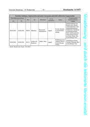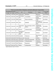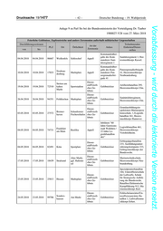 Deutscher Bundestag – 19. Wahlperiode – 43 – Drucksache 19/1477 Vorabfassung - wird durch die lektorierte Version ersetzt. Feierliche Gelöbnisse, Zapfenstreiche und andere Zeremonien außerhalb militärischer Liegenschaften Durchführungszeitraum Teilnehmenden Art der PLZ Ort Örtlichkeit Anlass Einheiten/Dienst- von bis Zeremonie stellen Dienst- Marineunteroffizier- eid/Feierli- 24.05.2018 24.05.2018 24306 Plön Marktplatz Gelöbnisfeier schule Plön, Marinemu- ches Ge- sikkorps Kiel. löbnis Burg, OT Auf dem Fest- Patenschaftsver- 24.05.2018 24.05.2018 39288 Appell 4./Logistikbataillon 171 Reesen platz anstaltung Dienst- Rekrutenkompanie 2 , eid/Feierli- Fallschirmjägerregiment 24.05.2018 24.05.2018 66663 Merzig Marktplatz Gelöbnisfeier ches Ge- 26, Heeresmusikkorps löbnis Koblenz. Dienst- Sanitätsregiment 1, Luft- eid/Feierli- 30.05.2018 30.05.2018 06686 Lützen Marktplatz Gelöbnisfeier waffenmusikkorps Er- ches Ge- furt. löbnis 60-jähriges Jubi- läum des Waf- Waffensystemunterstüt- Theater der 01.06.2018 01.06.2018 49356 Diepholz Appell fensystemunter- zungszentrum 2, Heeres- Stadt stützungszent- musikkorps Hannover. rums 2 Dienst- eid/Feierli- Sanitätslehrregiment, 04.06.2018 04.06.2018 94315 Straubing Am Stadtplatz Gelöbnisfeier ches Ge- Heeresmusikkorps Ulm. löbnis Dienst- Logistikbataillon 472, eid/Feierli- 07.06.2018 07.06.2018 92283 Lauterhofen Marktplatz Gelöbnisfeier Heeresmusikkorps ches Ge- Veitshöchheim. löbnis Großer Marinekommando, Hee- Ostseestadion Tag der Bundes- 09.06.2018 09.06.2018 18057 Rostock Zapfen- resmusikkorps Neubran- Rostock wehr streich denburg. Logistikkommando der Bundeswehr, Landes- Tag der Bundes- 09.06.2018 09.06.2018 99084 Erfurt Domplatz Appell kommando Thüringen, wehr Luftwaffenmusikkorps Erfurt. Dienst- Luftwaffenausbildungs- eid/Feierli- 13.06.2018 13.06.2018 76646 Bruchsal Schlosshof Gelöbnisfeier bataillon, Heeresmusik- ches Ge- korps Koblenz. löbnis Aussprechen von Marineunteroffizier- Marineehren- Anerkennung 14.06.2018 14.06.2018 24235 Laboe Appell schule Plön, Marinemu- mal von "Bester sikkorps Kiel. Bootsmann" Dienst- Dillingen Schlosshof eid/Feierli- IT-Bataillon 292, Hee- 14.06.2018 14.06.2018 89407 an der Do- Gelöbnisfeier Dillingen ches Ge- resmusikkorps Ulm. nau löbnis
