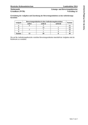 Nicht für den Prüfling bestimmt Hessisches Kultusministerium Landesabitur 2014 Mathematik Lösungs- und Bewertungshinweise Grundkurs (WTR) Vorschlag A1 Seite 3 von 3 Gewichtung der Aufgaben und Zuordnung der Bewertungseinheiten zu den Anforderungs- bereichen Bewertungseinheiten in den Anforderungsbereichen Aufgabe AFB I AFB II AFB III Summe 1 9 2 11 2 10 2 12 3 3 7 2 12 4 1 4 5 Summe 12 20 8 40 Die auf die Anforderungsbereiche verteilten Bewertungseinheiten innerhalb der Aufgaben sind als Richtwerte zu verstehen.