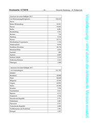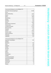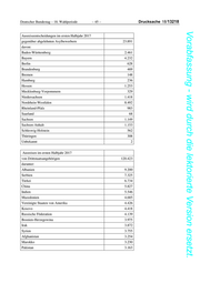 Deutscher Bundestag – 18. Wahlperiode – 43 – Drucksache 18/13218 Vorabfassung - wird durch die lektorierte Version ersetzt. Ausreiseentscheidungen im ersten Halbjahr 2017 gegenüber Drittstaatsangehörigen 52.908 davon: Baden-Württemberg 5.547 Bayern 8.736 Berlin 2.003 Brandenburg 1.385 Bremen 297 Hamburg 926 Hessen 2.889 Mecklenburg-Vorpommern 795 Niedersachsen 3.400 Nordrhein-Westfalen 17.576 Rheinland-Pfalz 1.405 Saarland 247 Sachsen 2.925 Sachsen-Anhalt 2.375 Schleswig-Holstein 1.006 Thüringen 964 unbekannt 432 Ausreiseentscheidungen im ersten Halbjahr 2017 gegenüber Unionsbürgern 953 darunter: Rumänien 334 Polen 158 Bulgarien 107 Litauen 56 Kroatien 49 Ungarn 38 Italien 31 Spanien 30 Griechenland 24 Lettland 24 Tschechische Republik 23 Slowakische Republik 16 Frankreich 16 Niederlande 16 Slowenien 8 Belgien 5