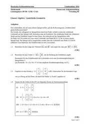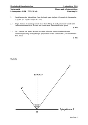Hessisches Kultusministerium Landesabitur 2016 Mathematik Thema und Aufgabenstellung Leistungskurs (WTR / GTR / CAS) Vorschlag B1 Seite 2 von 3 Lineare Algebra / Analytische Geometrie Aufgaben Für Lichtstrahlen, die auf einen ebenen Spiegel treffen, gilt das Reflexionsgesetz Einfallswinkel gleich Reflexionswinkel. Die Gerade, die orthogonal zur Spiegelebene durch den Punkt verläuft, in dem der einfallende Lichtstrahl auf den Spiegel trifft, bezeichnet man als Einfallslot. Der einfallende Strahl, der reflektierte Strahl und das Einfallslot liegen in einer Ebene, die senkrecht auf der Spiegelebene steht. Im Punkt A(2|7|4) sendet ein Laser einen Lichtstrahl zum Punkt B(3|2|2), der in einem ebenen Spiegel liegt. Der Spiegel soll so ausgerichtet werden, dass der Lichtstrahl zum Punkt C(13|4|10) reflektiert wird (Material). Der Einfallswinkel ist mit α bezeichnet. 1.1 Berechnen Sie die Länge der Vektoren BA und BC und zeigen Sie, dass gilt: BC =2⋅BA. (3 BE) 1.2 Berechnen Sie den Vektor v=BA+1 2BC, der die Richtung des Einfallslots angibt. Bestimmen Sie den Einfallswinkel des Lichtstrahls sowie eine Koordinatengleichung der Spiegelebene F. [zur Kontrolle: 2x 3y 6z 0+ + = ist eine mögliche Koordinatengleichung von F.] (6 BE) 1.3 Gegeben ist eine Gerade g : 3 12 x 2 r 18 2 13 = +⋅ − − , r∈I R. Untersuchen Sie die besondere Lage von g in Bezug auf die Ebene, die durch die Punkte A, B und C gegeben ist. (4 BE) 1.4 Deuten Sie die Zeilen (I) bis (IV) im folgenden Kasten im Sachzusammenhang: (5 BE) (I) 3 2 k : x 2 t 3 2 6 = +⋅ − (II) 2 2 H : x 7 3 0 2x 3y 6z 49 4 6 − ⋅=⇔+ + = (III) ( ) 2 (3 2t) 3 (2 3t) 6 ( 2 6t) 49 t 1; D 5 5 4 ⋅+ +⋅+ +⋅ −+ =⇔= (IV) ( )8 a 2 AD 3 ; P 8 3 4 4 +⋅=