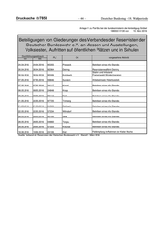 Drucksache 18/7858 – 44 – Deutscher Bundestag – 18. Wahlperiode Anlage 11 zu Parl Sts bei der Bundesministerin der Verteidigung Grübel 1880022-V139 vom 10. März 2016 Beteiligungen von Gliederungen des Verbandes der Reservisten der Deutschen Bundeswehr e.V. an Messen und Ausstellungen, Volksfesten, Auftritten auf öffentlichen Plätzen und in Schulen Durchführungszeitraum von bis PLZ Ort vorgesehene Aktivität 24.04.2016 24.04.2016 95355 Presseck Betreiben eines Info-Standes 30.04.2016 30.04.2016 92364 Deining Reservistenwallfahrt Deining Station und Infostand 30.04.2016 30.04.2016 95326 Kulmbach Frankenwald-Wandermarathon 07.05.2016 07.05.2016 59846 Sundern Arbeitseinsatz Hubertusstock 07.05.2016 07.05.2016 34117 Kassel Betreiben eines Info-Standes 08.05.2016 08.05.2016 24848 Kropp Betreiben eines Info-Standes 08.05.2016 08.05.2016 95112 Naila Betreiben eines Info-Standes 21.05.2016 22.05.2016 97725 Trimberg Betreiben eines Info-Standes 21.05.2016 21.05.2016 04509 Delitzsch Betreiben eines Info-Standes 22.05.2016 22.05.2016 57234 Wilnsdorf Betreiben eines Info-Standes 28.05.2016 28.05.2016 95100 Selb Betreiben eines Info-Standes 28.05.2016 28.05.2016 04860 Torgau Betreiben eines Info-Standes 29.05.2016 29.05.2016 57223 Kreuztal Betreiben eines Info-Standes 18.06.2016 18.06.2016 24106 Kiel Feldempfang im Rahmen der Kieler Woche Quelle: Verband der Reservisten der Deutschen Bundeswehr e.V., Stand: 1. März 2016