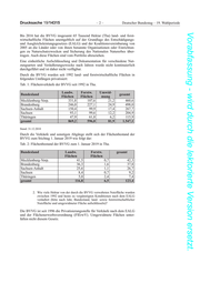 Deutscher Bundestag – 19. Wahlperiode –3– Drucksache 19/14315 Vorabfassung - wird durch die lektorierte Version ersetzt. Von den in Tabelle 1 ausgewiesen Flächenverkäufen wurden seit 1996 zu ver- günstigten Konditionen verkauft: Tab. 3: EALG-Flächenverkäufe seit 1996 in Tha. Bundesland Landw. Forstw. gesamt Flächen Flächen Mecklenburg-Vorp. 157,2 79,4 236,6 Brandenburg 115,4 178,3 293,7 Sachsen-Anhalt 90,1 84,7 174,8 Sachsen 56,3 79,8 136,1 Thüringen 21,7 53,8 75,5 gesamt 440,7 476,0 916,7 Stand: 31.12.2018 3. Wie viele Hektar von der durch die BVVG verwalteten Nutzfläche wurden zwischen 1992 und heute für Naturschutzzwecke veräußert (bitte nach Jahr und Bundesland aufschlüsseln)? Die BVVG hat seit 1992 für Naturschutzzwecke land- und forstwirtschaftliche Flächen im folgendem Umfang sowohl entgeltlich als auch unentgeltlich an die Länder und an von diesen benannte Stiftungen und Verbände übertragen: Tab. 4: Bereitstellung von BVVG-Flächen für Naturschutzzwecke in Tha. unentgeltlich entgeltlich gesamt Bundesland Wasserrahmen- Sonst. NSG 1 NNE NSG 2 Seenübertragung richtlinie Verkäufe MV 11,2 8,9 0,3 2,1 2,4 8,6 33,5 BB 12,3 11,0 2,9 4,4 2,0 7,1 39,6 ST 10,2 4,7 0,1 k. I. 4,5 1,7 21,2 SN 3,0 2,0 0,07 k. I. k. I. 3,0 8,0 TH 0,6 1,3 0,02 k. I. k. I. 0,7 2,6 gesamt 37,3 27,9 3,4 6,5 8,9 21,1 104,9 Stand: 24.09.2019, NSG 1 und 2 siehe EALG, NNE-Nationales Naturerbe, k. I.-kein Interesse 4. Wie viele Hektar Nutzfläche wurden zwischen 1992 und heute an das Land Mecklenburg-Vorpommern veräußert (bitte nach Jahr aufschlüsseln)? Neben den bereits in der Tabelle 4 ausgewiesenen 2,4 Tha zur Umsetzung der Wasserrahmenrichtlinie im Jahr 2016 und 2,1 Tha (darunter 1,8 Tha reine Wasserflächen) im Zusammenhang mit der Seenprivatisierung im Jahr 2011 und 2014 entgeltlich übertragenen Flächen wurden an das Land Mecklenburg- Vorpommern bzw. die Landgesellschaft Mecklenburg-Vorpommern rund 2,3 Tha landwirtschaftliche und sonstige Flächen veräußert, also insgesamt knapp 7 Tha. 5. Wie viele Hektar Nutzfläche wurden zwischen 1992 und heute an das Land Mecklenburg-Vorpommern kurz- oder langfristig verpachtet (bitte nach Jahr aufschlüsseln)? Die BVVG hat mit dem Land Mecklenburg-Vorpommern keine Pachtverträge abgeschlossen.