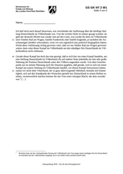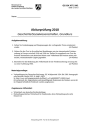 GS GK NT 2 W1 Seite 1 von 3 Name: _______________________ Abiturprüfung 2018 Nur für den Dienstgebrauch! Abiturprüfung 2018 Geschichte/Sozialwissenschaften, Grundkurs Aufgabenstellung: 1. Geben Sie Gedankengang und Hauptaussagen des vorliegenden Textes strukturiert wieder. (24 Punkte) 2. Ordnen Sie den Text in die politischen Bemühungen um eine internationale Friedens- ordnung in Europa zwischen 1918 und 1926 ein. Stellen Sie ausgehend vom Text der Position Stresemanns zum deutschen Beitritt zum Völkerbund die Position seiner poli- tischen, rechtsnationalen Gegner gegenüber. (34 Punkte) 3. Beurteilen Sie die Bedeutung des Völkerbunds für die Friedenssicherung in Europa bis zu seiner Auflösung 1946. (22 Punkte) Materialgrundlage: Verhandlungen des Deutschen Reichstags. III. Wahlperiode 1924. Bd. 389. Stenographi- sche Berichte, Berlin 1925, S. 6448 6451 In: http://www.reichstagsprotokolle.de/Blatt2_w3_bsb00000073_00001.html (Zwischenrufe der Abgeordneten und darauffolgende Reaktionen des Redners sowie der im Original befindliche Fettdruck wurden ausgelassen.) Zugelassene Hilfsmittel: Wörterbuch zur deutschen Rechtschreibung Herkunftssprachliches Wörterbuch für Studierende, deren Herkunftssprache nicht Deutsch ist