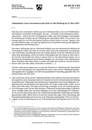 Ministerium für Schule und Bildung NRW GS GK NT 2 W1 Seite 2 von 9 Abiturprüfung 2018 Nur für den Dienstgebrauch! 5. Zugelassene Hilfsmittel Wörterbuch zur deutschen Rechtschreibung Herkunftssprachliches Wörterbuch für Studierende, deren Herkunftssprache nicht Deutsch ist 6. Vorgaben für die Bewertung der Schülerleistungen Teilleistungen Kriterien a) inhaltliche Leistung Teilaufgabe 1 Anforderungen maximal erreichbare PunktzahlDer Prüfling 1 benennt den Autor (Gustav Stresemann, deutscher Außenminister), die Textsorte (poli- tische Rede), die Adressaten (Reichstagsabgeordnete, Öffentlichkeit), Ort und Zeit- punkt der Rede (Reichstag Berlin, 22.03.1926) sowie die Art des zu untersuchenden Materials (Quelle). 2 2 nennt als Thema in etwa: politische Überlegungen bezüglich des Beitritts Deutsch- lands zum Völkerbund. 2 3 formuliert als Kernaussage in etwa: Man könne den Völkerbund als Bund zur Frie- denserhaltung oder als Völkervertretung sehen durch einen Beitritt würde Deutsch- lands Position unter den Völkern definitiv gestärkt. 4 4 gibt den Gedankengang des Autors mit Hilfe von Verben, die die argumentative Funk- tion der Hauptaussagen verdeutlichen, in etwa wie folgt wieder: Stresemann stellt zwei mögliche Sichtweisen auf den Völkerbund dar, behauptet, dass erst durch den Beitritt Deutschlands der Universalitätsanspruch des Völkerbunds Realität würde, erklärt die damals aktuelle Krise des Völkerbunds als Zeichen für die neue Gleich- berechtigung Deutschlands, widerlegt die Kritik von rechten Parteien mit dem Argument, dass Deutschlands Stellung durch den Völkerbund gestärkt würde. 4 5 gibt die Hauptaussagen des Textes in Verbindung mit dem in Kriterium 4 skizzierten Gedankengang strukturiert wieder (Die Trennung beider Kriterien erfolgt hier nur, um die Punktanteile ausweisen zu können.): Neben einer idealistischen Auffassung über den Völkerbund als Vereinigung der Völker zur Friedenswahrung stehe eine realistische Auffassung: Der Völkerbund sei eine diplomatische Möglichkeit der Völkervertretung. Erst durch das Beitrittsgesuch Deutschlands würde der Völkerbund seinem Univer- salitätsanspruch gerecht. Die durch das Beitrittsgesuch Deutschlands ausgelöste Krise des Völkerbunds belege, dass der Bund nicht länger Instrument der Siegermächte des Krieges bleibe, sondern Deutschland gleichberechtigte Großmacht werden könne. Die Kritik der rechten Parteien, Deutschland gehe damit auf die Siegermächte zu und unterwerfe sich ihnen, würde durch den tatsächlichen Kampf um eine ange- messene Stellung im Völkerbund, der Deutschland aufnehmen wolle, widerlegt. 12 6 erfüllt ein weiteres aufgabenbezogenes Kriterium. (2)