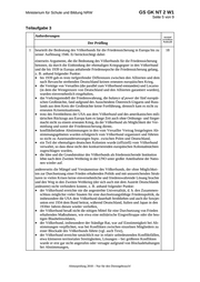 Ministerium für Schule und Bildung NRW GS GK NT 2 W1 Seite 5 von 9 Abiturprüfung 2018 Nur für den Dienstgebrauch! Teilaufgabe 3 Anforderungen maximal erreichbare PunktzahlDer Prüfling 1 beurteilt die Bedeutung des Völkerbunds für die Friedenssicherung in Europa bis zu seiner Auflösung 1946. Er berücksichtigt dabei einerseits Argumente, die die Bedeutung des Völkerbunds für die Friedenssicherung betonen, da durch die Einbindung der ehemaligen Kriegsgegner in den Völkerbund und die bis 1939 in Europa anhaltende Friedensepoche die Friedenssicherung gelang, z. B. anhand folgender Punkte: bis 1939 gab es trotz tiefgreifender Differenzen zwischen den Alliierten und dem nach Revanche strebenden Deutschland keinen erneuten europäischen Krieg, die Verträge von Versailles (die parallel zum Völkerbund entstanden) und Locarno (in dem die Westgrenzen von Deutschland und den Alliierten garantiert wurden), wurden einvernehmlich eingehalten, das Vorkriegsmodell der Friedenswahrung, die balance of power der fünf europäi- schen Großmächte, fand aufgrund des Ausscheidens Österreich-Ungarns und Russ- lands aus dem Kreis der Großmächte keine Fortführung, dennoch kam es nicht zu erneuten Krisensituationen, trotz des Fernbleibens der USA aus dem Völkerbund und des amerikanischen mili- tärischen Rückzugs aus Europa kam es lange Zeit auch ohne Ordnungs- und Sieger- macht nicht zu einem erneuten Krieg, da der Völkerbund als Möglichkeit der Ver- mittlung und somit der Friedenssicherung diente, konfliktbeladene Abstimmungen in den vom Versailler Vertrag festgelegten Ab- stimmungsgebieten wurden erfolgreich vom Völkerbund organisiert und führten so nicht zu Auseinandersetzungen bspw. zwischen Polen und Deutschland, ein Teil der ehemaligen deutschen Kolonien wurde (offiziell) vom Völkerbund verwaltet, so dass diese nicht den konkurrierenden europäischen Kolonialmächten zugeschlagen wurden, die Idee und die Grundstruktur des Völkerbunds als friedenssichernde Institution lebte nach dem Zweiten Weltkrieg in der UNO unter großer Anteilnahme der Natio- nen wieder auf. andererseits die Mängel und Versäumnisse des Völkerbunds, der ohne Möglichkei- ten zur Durchsetzung einer Frieden erhaltenden Politik und mit unzureichenden Struk- turen in vielen Krisen keine einvernehmliche und friedenswahrende Lösung brachte und den Weg in den Zweiten Weltkrieg (der sich auch mit dem Austritt Deutschlands andeutete) nicht verhindern konnte, z. B. anhand folgender Punkte: der Völkerbund erreichte nie die angestrebte Universalität, d. h. den Zusammen- schluss möglichst vieler Staaten für eine durchsetzungsfähige Friedenspolitik, da insbesondere die USA dem Völkerbund dauerhaft fernblieben und auch die Sowjet- union erst 1934 dem Bund beitrat, während Deutschland, Italien und Japan in den 1930er Jahren diesen wieder verließen, der Völkerbund besaß nicht die nötigen Mittel für eine Durchsetzung von Frieden erhaltenden Maßnahmen, wie etwa eine militärische Eingreiftruppe oder die heu- tigen Blauhelmsoldaten, der Völkerbund, insbesondere der Ständige Rat, war auf Einstimmigkeit bei Ab- stimmungen verpflichtet, was bei Konflikten zwischen einzelnen Mitgliedern zu einer Blockade des Völkerbunds führte (vgl. auch Text), der Völkerbund erreichte tatsächlich nur in relativ unbedeutenden Konfliktfällen, etwa kleineren territorialen Streitigkeiten, Lösungen bei größeren Konflikten wurde er erst gar nicht angerufen oder versagte aufgrund von Blockadehaltungen bei Abstimmungen, 18