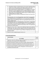 Ministerium für Schule und Bildung NRW GS GK NT 2 W1 Seite 6 von 9 Abiturprüfung 2018 Nur für den Dienstgebrauch! Deutschland verließ den Völkerbund bereits 1933 nach dem Machtantritt Hitlers, da Hitler den Versailler Vertrag mit allen Mitteln revidieren wollte und der Völ- kerbund von ihm als Machtinstrument der Siegermächte gesehen wurde, Hitler verlangte zudem die Wiederherstellung der Vorkriegsgrenzen bzw. die An- gliederung von deutsch besiedelten Gebieten, was den Verträgen von Versailles und auch von Locarno entgegenstand, die vom Völkerbund garantiert wurden, auch andere Konflikte innerhalb Europas konnten durch den Völkerbund nicht bei- gelegt werden, etwa der Bürgerkrieg in Spanien oder die Verstöße der National- sozialisten gegen den Versailler Vertrag, letztlich kam es trotz des Wirkens des Völkerbunds 1939 doch zum Zweiten Welt- krieg. Orientierung für eine 9 Gewichtungspunkten entsprechende Lösungsqualität: Der Prüfling gelangt unter Bezugnahme auf den Text zu einer nachvollziehbaren Argumentation, in der insgesamt mindestens zwei Gesichtspunkte aus den beiden Blöcken sachgerecht berücksichtigt werden. Die Argumentation enthält keine gravie- renden sachlichen Fehler. Orientierung für eine 18 Gewichtungspunkten entsprechende Lösungsqualität: Der Prüfling entwickelt unter vertiefter Bezugnahme auf den Text eine differenzierte Argumentation, in der erörternd insgesamt mindestens vier Gesichtspunkte ausgewo- gen aus den beiden Blöcken sachgerecht berücksichtigt werden. Die Argumentation enthält keine sachlichen Fehler. 2 formuliert ein Fazit, in dem er zeigt, dass der Völkerbund aufgrund seiner politischen Mängel kaum in der Lage war, die ihm zugedachte Rolle in der internationalen Poli- tik auszufüllen. Dies gilt insbesondere in Bezug auf die deutsche Politik, die als Ziel immer die Revision des Versailler Vertrags verfolgte und langfristig in den Zweiten Weltkrieg mündete. 4 3 erfüllt ein weiteres aufgabenbezogenes Kriterium. (4) b) Darstellungsleistung Anforderungen maximal erreichbare Punktzahl Der Prüfling 1 strukturiert seinen Text schlüssig, stringent sowie gedanklich klar und bezieht sich dabei genau und konsequent auf die Aufgabenstellung. 5 2 bezieht beschreibende, deutende und wertende Aussagen schlüssig aufeinander. 4 3 belegt seine Aussagen durch angemessene und korrekte Nachweise (Zitate u. a.). 3 4 formuliert unter Beachtung der Fachsprache präzise und begrifflich differenziert. 4 5 schreibt sprachlich richtig (Grammatik, Orthographie, Zeichensetzung) sowie syntaktisch und stilistisch sicher. 4