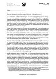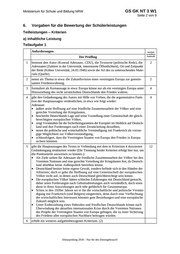 Ministerium für Schule und Bildung NRW GS GK NT 3 W1 Seite 2 von 9 Abiturprüfung 2018 Nur für den Dienstgebrauch! 6. Vorgaben für die Bewertung der Schülerleistungen Teilleistungen Kriterien a) inhaltliche Leistung Teilaufgabe 1 Anforderungen maximal erreichbare PunktzahlDer Prüfling 1 benennt den Autor (Konrad Adenauer, CDU), die Textsorte (politische Rede), die Adressaten (Zuhörer in der Universität, interessierte Öffentlichkeit), Ort und Zeitpunkt der Rede (Kölner Universität, 24.03.1946) sowie die Art des zu untersuchenden Mate- rials (Quelle). 2 2 nennt als Thema in etwa: die Zukunftsvision eines vereinigten Europa zur gemein- samen Friedenswahrung. 2 3 formuliert als Kernaussage in etwa: Europa könne nur als ein vereinigtes Europa unter Hinzuziehung des nicht zerstückelten Deutschlands den Frieden wahren. 4 4 gibt den Gedankengang des Autors mit Hilfe von Verben, die die argumentative Funk- tion der Hauptaussagen verdeutlichen, in etwa wie folgt wieder: Adenauer äußert seine Hoffnung auf eine friedliche Zusammenarbeit der Völker und eine gerechte Verteilung der Kriegslasten, beschreibt Deutschlands Lage und seine Vorstellung einer Gemeinschaft der gleich- berechtigten europäischen Völker, zeigt Verständnis für die Sicherheitsgarantien der Europäer im Hinblick auf Deutsch- land und ihre Forderungen nach einer Zerstückelung desselben, nennt die politische und wirtschaftliche Verständigung mit Frankreich als vorran- gige Möglichkeit zur Völkerverständigung, schlussfolgert, dass die Vereinigten Staaten von Europa den Frieden in Europa sichern könnten. 4 5 gibt die Hauptaussagen des Textes in Verbindung mit dem in Kriterium 4 skizzierten Gedankengang strukturiert wieder (Die Trennung beider Kriterien erfolgt hier nur, um die Punktanteile ausweisen zu können.): Als Ziele stehen für Adenauer die friedliche Zusammenarbeit der Völker bei den Vereinten Nationen und eine gerechte Verteilung der Kriegslasten fest, da Deutsch- land absehbar keine Außenpolitik betreiben könne. Deutschland besitze keine eigene Gewalt, sondern befinde sich in den Händen der Alliierten; doch er gebe die Hoffnung auf eine Gemeinschaft der europäischen Völker nicht auf, in denen auch Deutschland gleichberechtigt sein könne. Die europäischen Völker hätten schlechte Erfahrungen mit Deutschland gemacht, daher seien Forderungen nach Gebietsabtretungen auch verständlich, doch seien diese in ihren Auswirkungen auch sehr gefährlich für Gesamteuropa. Schon in den 1920er Jahren sei er für die wirtschaftliche und politische Verstän- digung mit Frankreich (und Belgien) eingetreten, denn durch eine Verflechtung der wirtschaftlichen Interessen könnten gute Beziehungen und eine europäische Zukunft möglich sein. Unter Einbeziehung eines föderalen und friedlichen Deutschlands könne nach Überwindung der aktuellen internationalen Krise durch die Vereinten Nationen das Projekt der Vereinigten Staaten von Europa gelingen, die zu einer Sicherung des Friedens aller europäischen Nachbarn beitragen würden. 12 6 erfüllt ein weiteres aufgabenbezogenes Kriterium. (2)