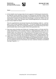 GS GK NT 3 W1 Seite 1 von 3 Name: _______________________ Abiturprüfung 2018 Nur für den Dienstgebrauch! Abiturprüfung 2018 Geschichte/Sozialwissenschaften, Grundkurs Aufgabenstellung: 1. Geben Sie Gedankengang und Hauptaussagen des vorliegenden Textes strukturiert wieder. (24 Punkte) 2. Ordnen Sie den Text in die westdeutsche Nachkriegszeit der Jahre 1945 1949 ein und charakterisieren Sie Adenauers Perspektive auf die zu gründenden Vereinigten Staaten von Europa. (34 Punkte) 3. Prüfen Sie mit Blick auf die weitere historische Entwicklung bis heute, inwieweit seine europapolitischen Ideen Realität geworden sind. (22 Punkte) Materialgrundlage: Konrad Adenauer: Rede in der Aula der Universität zu Köln (24. März 1946) In: https://www.konrad-adenauer.de/dokumente/reden/1946-03-24-uni-koeln Zugelassene Hilfsmittel: Wörterbuch zur deutschen Rechtschreibung Herkunftssprachliches Wörterbuch für Studierende, deren Herkunftssprache nicht Deutsch ist