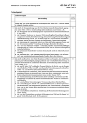 Ministerium für Schule und Bildung NRW GS GK NT 3 W1 Seite 3 von 9 Abiturprüfung 2018 Nur für den Dienstgebrauch! Teilaufgabe 2 Anforderungen maximal erreichbare Punktzahl Der Prüfling ordnet den Text in die westdeutsche Nachkriegszeit der Jahre 1945 1949 ein, indem er folgende Aspekte anführt: 1 die durch die Kriegsniederlage und die Vier-Mächte-Kontrolle Deutschlands gepräg- ten Jahre 1945 1947; er berücksichtigt dabei mindestens zwei Punkte, z. B.: das Kriegsende und die bedingungslose Kapitulation des Deutschen Reichs am 8. Mai 1945, die Potsdamer Konferenz im Sommer 1945, deren Ergebnis Deutschland in Besat- zungszonen einteilte, Entmilitarisierung, Entnazifizierung, Dezentralisierung und Demokratisierung vorsah, und in deren Folge die von Adenauer erwähnten alliierten Mächte mit ihren Truppen die Besatzung in Deutschland ausübten, die Abtrennung der Landesteile östlich von Oder und Neiße zugunsten Polens und der Sowjetunion und die Vertreibung der dortigen deutschen Bewohner, das wie von Adenauer erwähnt Erlöschen jeglicher Souveränität und Regie- rungsaktivität auf Landes- und kommunaler Ebene und der Selbstverwaltung durch deutsche Behörden, die gemeinsame Kontrolle des besetzten Deutschlands durch die Alliierte Kontroll- behörde, die Auflösung des von Adenauer ebenfalls derart bezeichneten als militaris- tisch und zentralistisch geltenden Landes Preußen durch die Alliierten. 8 2 die durch den Bruch der Anti-Hitler-Koalition und die von Vorgaben, aber auch Unter- stützung zur Selbstständigkeit geprägte politische und wirtschaftliche Entwicklung im Westen Deutschlands bis zur Berliner Blockade; er berücksichtigt dabei mindestens zwei Punkte, z. B.: die am 12. März 1947 verkündete Truman-Doktrin, die für die von der Sowjet- union bedrohten Völker eine US-amerikanische Unterstützung nach sich ziehen sollte, was auch für West-Deutschland Relevanz besaß, in deren Folge die Etablierung eines demokratischen und marktwirtschaftlich geprägten Systems in den westlichen Zonen und deren zunehmender wirtschaft- licher und politischer Zusammenarbeit (etwa mit der Bizone 1947), die Demokratisierung in den Westzonen durch Gründung von Parteien und die Einrichtung von (Bundes-)Ländern und demokratischen Wahlen in Kommunen und Ländern, die wirtschaftliche Unterstützung der Westzonen durch den Marshall-Plan, die Übersiedlung bzw. Flucht von zahlreichen Menschen aus der Sowjetzone in den Westen nach 1945 aufgrund von politischer und wirtschaftlicher Unzufrieden- heit, was für den Westen neben moralischem Gewinn eine wirtschaftliche Belas- tung darstellte, die wirtschaftliche und politische Annäherung der Französischen Besatzungszone an die Bizone, die von den Westmächten veranlasste Währungsreform 1948 und die darauf fol- gende Berlin-Blockade durch die Sowjetunion. 8