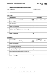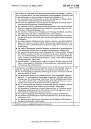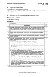 Ministerium für Schule und Bildung NRW GS GK HT 1 W1 Seite 6 von 9 Abiturprüfung 2018 Nur für den Dienstgebrauch! 2 ein zusammenfassendes Fazit formuliert, in dem er das Frauenbild des Autors als chauvinistisch, patriarchalisch und reaktionär klassifiziert und seine Vorstellungen zur Frauenfrage und Frauenrechten als nicht mit den Vorstellungen und den grund- legenden Werten des Grundgesetzes vereinbar bewertet und deutlich macht, dass das Frauenbild des Autors konträr zu dem ist, welches heute in Verfassung und Gesell- schaft vorherrscht. 4 3 erfüllt ein weiteres aufgabenbezogenes Kriterium. (4) b) Darstellungsleistung Anforderungen maximal erreichbare Punktzahl Der Prüfling 1 strukturiert seinen Text schlüssig, stringent sowie gedanklich klar und bezieht sich dabei genau und konsequent auf die Aufgabenstellung.5 2 bezieht beschreibende, deutende und wertende Aussagen schlüssig aufeinander. 4 3 belegt seine Aussagen durch angemessene und korrekte Nachweise (Zitate u. a.). 3 4 formuliert unter Beachtung der Fachsprache präzise und begrifflich differenziert. 4 5 schreibt sprachlich richtig (Grammatik, Orthographie, Zeichensetzung) sowie syntaktisch und stilistisch sicher. 4