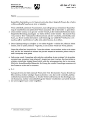 Ministerium für Schule und Bildung NRW GS GK HT 1 W1 Seite 2 von 9 Abiturprüfung 2018 Nur für den Dienstgebrauch! 5. Zugelassene Hilfsmittel Wörterbuch zur deutschen Rechtschreibung Herkunftssprachliches Wörterbuch für Studierende, deren Herkunftssprache nicht Deutsch ist 6. Vorgaben für die Bewertung der Schülerleistungen Teilleistungen Kriterien a) inhaltliche Leistung Teilaufgabe 1 Anforderungen maximal erreichbare PunktzahlDer Prüfling 1 benennt den Autor (Daniel Fryman / Heinrich Claß), die Textsorte (Auszug aus einem Buch), Erscheinungsort und -zeit (Leipzig, 1913), die Adressaten (Leserschaft, inte- ressierte Öffentlichkeit), und die Art des zu untersuchenden historischen Materials (Quelle). 2 2 nennt als Thema des vorliegenden Textes in etwa: die Gleichberechtigung von Mann und Frau. 2 3 formuliert als Kernaussage: Die politische Gleichberechtigung der Frau sei aus vielen Gründen abzulehnen. 4 4 arbeitet den Gedankengang des Autors mit Hilfe von Verben, die die argumentative Funktion der Hauptaussagen verdeutlichen, in etwa wie folgt heraus: Frymann/Claß erklärt, warum die politische Teilhabe der Frauen abzulehnen sei, behauptet, die Natur habe jedem Geschlecht eine eigene Rolle zugewiesen, erläutert, warum er den Frauen das Wahlrecht verweigert, spricht sich für wirtschaftliche Verbesserungen für Frauen im Kontext der Sozia- len Frage aus. 4 5 gibt die Hauptaussagen des Textausschnitts in Verbindung mit dem in Kriterium 4 skizzierten Gedankengang strukturiert wieder (Die Trennung beider Kriterien erfolgt hier nur, um die Punkteanteile ausweisen zu können.): Die politische Arbeit sei hart und unsauber und damit für Frauen unangemessen, weshalb national eingestellte Männer deren politische Beteiligung ablehnten. Die Vorstellung Rousseaus von der Gleichheit von Mann und Frau sei falsch, viel- mehr unterschieden sie sich wesentlich und beide hätten jeweils eigene Aufgaben zu erfüllen. Frauen hätten auch ohne Wahlrecht und Teilhabe die Möglichkeit politisch unter- richtet zu werden und staatsbürgerliche Erziehung sei auch nicht ihre Aufgabe. Die große Aufgabe der Frau sei es, Patriotismus zu vermitteln und dafür brauche es keine politische Mitsprache. Es sei die Pflicht der Männer, zusammen mit den Frauen eine Lösung der sozialen Nöte der Frauen zu finden; es dürfe jedoch auf dem Arbeitsmarkt nicht zu einem Wettbewerb zwischen den Geschlechtern kommen, da dies für beide Geschlechter negative Folgen habe. 8 6 erfüllt ein weiteres aufgabenbezogenes Kriterium. (2)