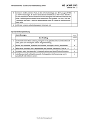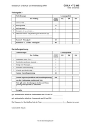 Ministerium für Schule und Weiterbildung NRW GS LK HT 2 W2 Seite 10 von 11 Nur für den Dienstgebrauch! Teilaufgabe 3 Anforderungen Lösungsqualität Der Prüflingmaximal erreichbare Punktzahl EK ZK DK setzt sich mit … 1 die Frage nach … 12 2 die Frage nach … 8 3 formuliert ein bewertendes … 4 4 erfüllt ein weiteres aufgabenbezogenes Kriterium: (4) …………………………………………………………….. …………………………………………………………….. Summe 3. Teilaufgabe 24 Summe der 1., 2. und 3. Teilaufgabe 80 Darstellungsleistung Anforderungen Lösungsqualität Der Prüfling maximal erreichbare Punktzahl EK ZK DK 1 strukturiert seinen Text … 5 2 bezieht beschreibende, deutende … 4 3 belegt seine Aussagen … 3 4 formuliert unter Beachtung … 4 5 schreibt sprachlich richtig … 4 Summe Darstellungsleistung 20 Summe insgesamt (inhaltliche und Darstellungsleistung) 100 aus der Punktsumme resultierende Note Note ggf. unter Absenkung um ein bis zwei Noten punkte gemäß § 17 Abs. 5 APOWbK Paraphe ggf. arithmetisches Mittel der Punktsummen aus EK und ZK: ___________ ggf. arithmetisches Mittel der Notenurteile aus EK und ZK: _____________ Die Klausur wird abschließend mit der Note: ________________________ (____ Punkte) bewertet. Unterschrift, Datum: