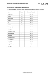 Ministerium für Schule und Weiterbildung NRW GS LK HT 2 W2 Seite 11 von 11 Nur für den Dienstgebrauch! Grundsätze für die Bewertung (Notenfindung) Für die Zuordnung der Notenstufen zu den Punktzahlen ist folgende Tabelle zu verwenden: Note Punkte Erreichte Punktzahl sehr gut plus 15 100 – 95 sehr gut 14 94 – 90 sehr gut minus 13 89 – 85 gut plus 12 84 – 80 gut 11 79 – 75 gut minus 10 74 – 70 befriedigend plus 9 69 – 65 befriedigend 8 64 – 60 befriedigend minus 7 59 – 55 ausreichend plus 6 54 – 50 ausreichend 5 49 – 45 ausreichend minus 4 44 – 39 mangelhaft plus 3 38 – 33 mangelhaft 2 32 – 27 mangelhaft minus 1 26 – 20 ungenügend 0 19 – 0