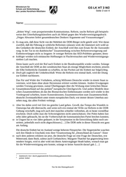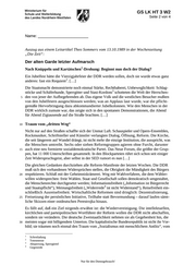 GS LK HT 3 W2 Seite 2 von 4 Name: _______________________ Nur für den Dienstgebrauch! Auszug aus einem Leitartikel Theo Sommers vom 13.10.1989 in der Wochenzeitung „Die Zeit“: Der alten Garde letzter Aufmarsch Nach Knüppeln und Kartätschen1Drohung: Beginnt nun doch der Dialog? Ein Jubelfest hätte die Vierzigjahrfeier der DDR werden sollen, doch sie wurde etwas ganz anderes: fast ein Requiem2. […] Die Staatsmacht demonstrierte noch einmal Stärke, Rechthaberei, Unbeweglichkeit: Schlag stöcke und Schäferhunde, Sperrgitter und StasiKordons3 schotteten die Welt der Herrschen den von jener der Aufbegehrenden ab. Das eigene Volk und die westlichen Besucher mußten 5 von den Jubelfeiern ausgeschlossen werden;was an Applaus laut wurde, war die pflicht gemäße Hervorbringung dazu abkommandierter Jubelkolonnen. Wie den Menschen in der DDR wirklich zumute war, das zeigte sich in den spontanen Demonstrationen, die Abend für Abend Zigtausende auf die Straße brachten. […] Traum vom „dritten Weg“ 10 Nicht nur auf den Straßen schaffte sich der Unmut Luft. Schauspieler und OpernEnsembles, Rockmusiker, Schriftsteller und Künstler verlangten Dialog, Öffnung, Reform. Die Kirche, die seit längerem auf Wandel drängt, ist nicht mehr die einzige Institution, die ausspricht, was die Menschen umtreibt. Sechs oder sieben Reformgruppen agieren ohne Furcht, darunter auch eine neu formierte sozialdemokratische Partei. Das Neue Forum, die größte der Grup15 pen, hat 11 000 Unterschriften gesammelt. In den Blockparteien rührt sich schon seit einiger Zeit Widerspruchsgeist, aber selbst in der SED rumort es nun […] Die gleichen Gedanken durchziehen alle ReformManifeste der letzten Wochen. Die DDR muß sich den vorhandenen Widersprüchen stellen, die Obrigkeit die Mündigkeit des Bürgers respektieren. Schluß mit der Geheimniskrämerei. Weg mit Wahlverfahren, die dem Wähler20 willen widersprechen: freie Wahlen. Staat und Gesellschaft sollen demokratisch umgestaltet, die Menschenrechte durchgesetzt werden; Informationsfreiheit („Information ist Bürgerrecht und Staatspflicht“), Meinungsfreiheit („Widerrrede4 ist nicht Widerstand“), Reisefreiheit ein schließlich Ausreisefreiheit. Wirtschaftliche Reformen sind dringlich: Dezentralisierung, Freisetzung der persönlichen Initiative, Teilhabe statt Bevormundung – darauf laufen sämt25 liche Skizzen einer ostdeutschen Perestrojka hinaus. Es fällt auf, daß ein Ziel nirgends erwähnt ist: die Wiedervereinigung. Die intellektuellen, kirchlichen und parteipolitischen Wortführer der Reform wollen die DDR nicht abschaffen, sondern sie verändern. Die deutsche Zweistaatlichkeit nehmen sie als Gegebenheit hin, die meisten sogar mit billigendem Unterton. Die kapitalistische Bundesrepublik ist nicht ihr Vor30 bild; sie träumen noch einmal den Traum vom „Sozialismus mit menschlichem Antlitz“, vom 1 Schrotladung 2 Totenmesse 3 Absperrung, Sperrgürtel 4 Gegenrede