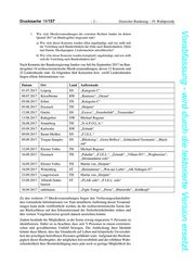 Deutscher Bundestag – 19. Wahlperiode –7– Drucksache 19/157 Vorabfassung - wird durch die lektorierte Version ersetzt. Nach Kenntnis der Bundesregierung fanden im zweiten Quartal 2017 sieben wei- tere sonstige Veranstaltungen mit Musikdarbietung statt, so dass nunmehr 29 (22) stattgefundene sonstige Musikveranstaltungen bekannt wurden. Zu der nachge- meldeten sonstigen Musikveranstaltung liegen offene Informationen vor: Datum Ort Land Auftretende 20.05.2017 Ganderkesee NI „Wut aus Liebe“ Zu den weiteren sechs nachgemeldeten sonstige Veranstaltungen mit Musikdar- bietung liegen den Verfassungsschutzbehörden lediglich vertrauliche Informati- onen vor. Eine detaillierte Auflistung dieser Veranstaltungen kann aus den bereits in der Antwort zu Frage 1 dargestellten Gründen nicht veröffentlicht werden. Aufgrund der nachgemeldeten Veranstaltungen kommt es für das zweite Quartal 2017 zu folgenden geänderten Besucherzahlen. Zu zwei der sonstigen Veranstal- tungen liegen keine Besucherzahlen vor. Die verbleibenden 27 sonstigen Veran- staltungen mit Musikdarbietung wurden von 2 670 (2 219) Personen besucht, das ergibt einen Durchschnitt von ca. 99 (111) Personen. Nach Kenntnis der Bundesregierung fand im zweiten Quartal 2017 ein weiteres Konzert im Ausland statt, bei dem eine deutsche rechtsextremistische Musik- gruppe auftrat. Dabei handelt es sich um ein Konzert am 30. April 2017 in Kiew/Ukraine, bei dem die deutsche Musikgruppe „Lunikoff-Verschwörung“ auftrat. Zu den weiteren Fragen ergaben sich keine Nachmeldungen. 13. Wurden im Rahmen von Konzerten der extremen Rechten im dritten Quartal 2017 Tonträger von der Polizei beschlagnahmt, und wenn ja, welchen Inhalts waren diese Tonträger, und in welcher Stückzahl wurden sie beschlagnahmt (bitte nach Bundesländern, Ort und Datum auflisten)? Der Bundesregierung wurde für das dritte Quartal 2017 eine Beschlagnahme von Tonträgern bekannt. Dabei handelt es sich um eine Beschlagnahme im Rahmen der sonstigen Veranstaltung am 1. Juli 2017 in Gera/Thüringen, bei der ein Ver- kaufstand des „Germania-Versands“ betrieben und Tonträger (CD, EP und LP) sowie Bekleidungsgegenstände verkauft wurden. Es wurden 26 Tonträger sicher- gestellt. 14. Welche sonstigen Beschlagnahmungen von Tonträgern der extremen Rech- ten gab es im dritten Quartal 2017, und welchen Inhalts waren diese Tonträ- ger, bzw. in welcher Stückzahl wurden sie beschlagnahmt (bitte nach Bun- desländern, Ort und Datum auflisten)? Der Bundesregierung liegen keine abschließenden Erkenntnisse im Sinne der Fra- gestellung vor. Grund hierfür ist, dass eine dezidierte Meldepflicht der Länder über Sicherstellungen von Tonträgern und deren Inhalte aus dem Bereich der Po- litisch motivierten Kriminalität (PMK) nicht besteht. Einzelerkenntnisse im Sinne der Fragestellung liegen der Bundesregierung je- doch immer dann vor, wenn die Länder im Rahmen des Kriminalpolizeilichen Meldedienstes Politisch motivierte Kriminalität (KPMD-PMK) Straftaten mel- den, die im Zusammenhang mit dem Tatmittel „Tonträger“ stehen, und diese Mel- dungen auch Erkenntnisse zu entsprechenden Sicherstellungen beinhalten.