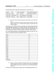 Drucksache 19/157 –8– Deutscher Bundestag – 19. Wahlperiode Vorabfassung - wird durch die lektorierte Version ersetzt. Im dritten Quartal 2017 liegen diese Informationen zu drei Fällen vor: Datum Ort Land Stückzahl strafrechtliche Relevanz 01.07.2017 Gera TH 26 CDs § 86a und § 130 StGB 24.07.2017 Wolfsburg NI Ein USB-Stick § 86a StGB 27.07.2017 Wismar MV Mehrere CDs § 86a StGB 15. Wie viele rechtsextremistische Tonträger wurden bisher im Jahr 2017 indi- ziert? Handelt es sich dabei um Tonträger, die im Jahr 2017 produziert und veröf- fentlicht wurden, bzw. aus welchen Jahren stammen die im Jahr 2017 indi- zierten Tonträger? Im Zeitraum vom 1. Januar 2017 bis 30. September 2017 hat die Bundesprüfstelle für jugendgefährdende Medien 56 Tonträger aufgrund Verherrlichung oder Ver- harmlosung des Nationalsozialismus und/oder aufgrund Verherrlichung oder Verharmlosung des Krieges und/oder aufgrund rassistischer Inhalte indiziert. Die von der Bundesprüfstelle für jugendgefährdende Medien im Jahr 2017 indi- zierten 56 Tonträger stammen aus folgenden Jahren: 2017 6 2016 24 2015 6 2014 2 2013 1 2012 1 2011 1 2010 1 2007 2 2006 3 2005 1 2003 1 2002 2 2001 1 1999 2 1998 1 unbekannt 1 16. Gegen wie viele der im Jahr 2017 indizierten und in Liste B eingetragenen rechtsextremistischen Tonträger, bei denen der Verdacht auf strafrechtlich relevante Inhalte besteht, lag im selben Jahr noch ein Beschlagnahmebe- schluss vor? Zu keinem der entsprechenden Tonträger liegt ein Beschlagnahmebeschluss vor.